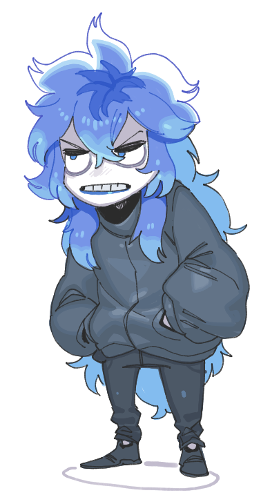 1boy bags_under_eyes blue_eyes blue_hair colored_skin full_body grey_footwear grey_pants grey_sweater grimace hair_between_eyes hands_in_pockets idia_shroud long_hair male_focus pants sido_(slipknot) simple_background solo sweater twisted_wonderland white_background white_skin
