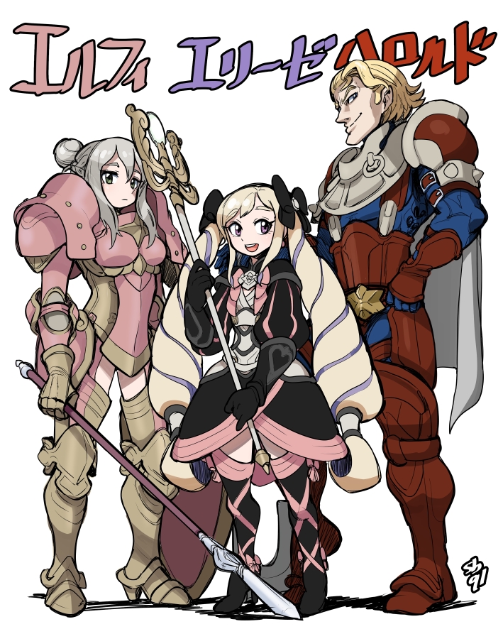 1boy 2girls aristocratic_clothes armor arthur_(fire_emblem_fates) blonde_hair drill_hair effie_(fire_emblem) elise_(fire_emblem) fire_emblem fire_emblem_fates full_body green_eyes grey_hair hair_bun looking_at_viewer multicolored_hair multiple_girls nintendo pink_armor purple_eyes purple_hair sbql_(niaunclefan) single_hair_bun streaked_hair twin_drills