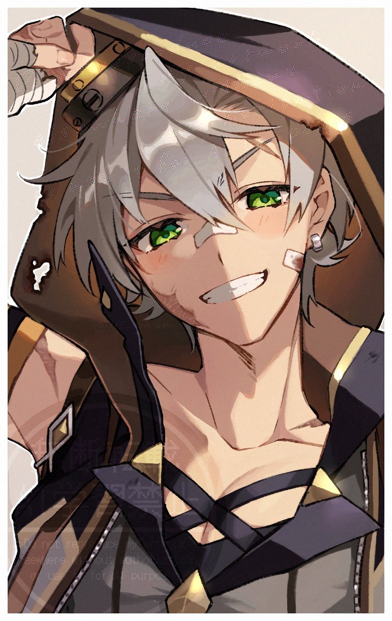 1boy bandages bandaid bandaid_on_cheek bandaid_on_face bandaid_on_nose bennett_(genshin_impact) earrings genshin_impact goggles goggles_on_head green_eyes grey_hair highres hood hood_up jewelry looking_at_viewer male_focus mt_gnsn portrait scar scar_across_eyebrow scar_on_arm scar_on_face simple_background solo