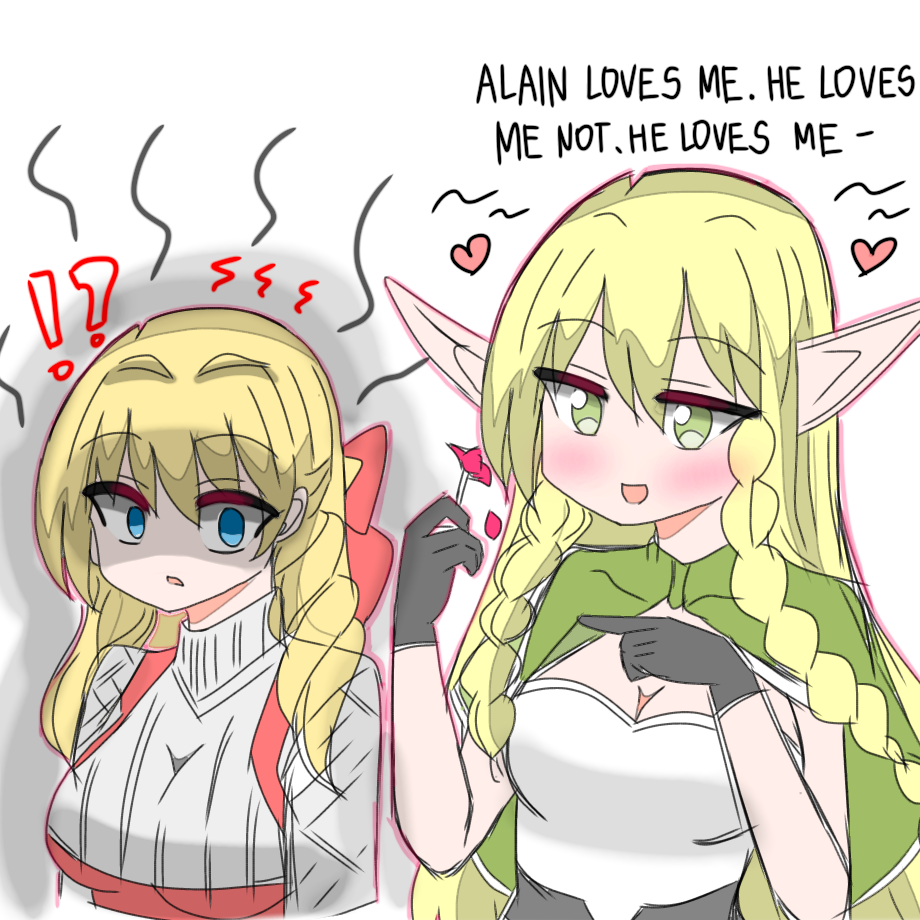 !? 2girls black_gloves blonde_hair blue_eyes blush bow braid capelet dress drill_hair elf eltolinde_(unicorn_overlord) english_text flower gloves green_capelet green_eyes hair_between_eyes hair_bow heart holding holding_flower long_hair looking_at_another multiple_girls pointy_ears red_bow red_dress red_flower reign_(user_pgfa7472) ribbed_sweater scarlett_(unicorn_overlord) shaded_face simple_background sweater turtleneck turtleneck_sweater twin_braids twin_drills unicorn_overlord white_background white_sweater