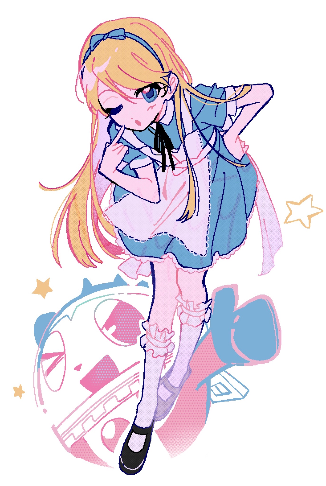 1boy ;o alice's_adventures_in_wonderland alice_(alice_in_wonderland) alice_(alice_in_wonderland)_(cosplay) apron artist_name back_bow black_ribbon black_shoes blonde_hair blue_bow blue_dress blue_eyes blue_hairband blush bow bow_hairband collared_dress cosplay crossdressing crossdressing_(mtf) dress frilled_dress frilled_socks frills full_body hairband hand_on_own_hip highres kirokuyyyy kneehighs kuma_(human)_(persona_4) kuma_(persona_4) leaning_forward long_hair looking_at_viewer male_focus mary_janes neck_ribbon one_eye_closed open_mouth persona persona_4 puffy_short_sleeves puffy_sleeves ribbon shoes short_sleeves signature simple_background socks solo standing star_(symbol) trap white_apron white_background white_bow white_socks wing_collar