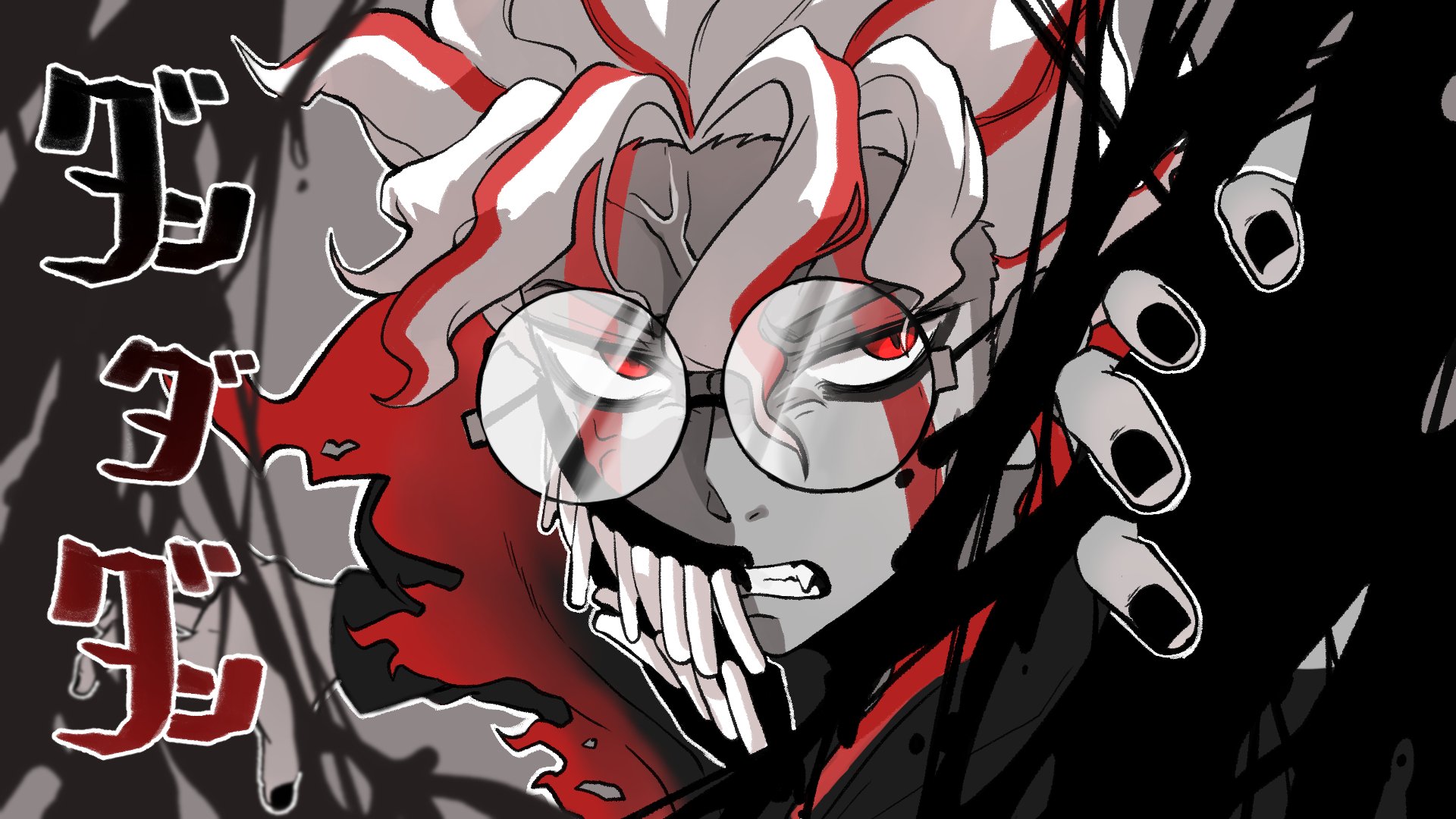 1boy alternate_form black_nails commentary_request dandadan facial_mark glasses highres korean_commentary male_focus mask mouth_mask red_eyes round_eyewear solo takakura_ken_(dandadan) takakura_ken_(transformed)_(dandadan) transformation wolf6481