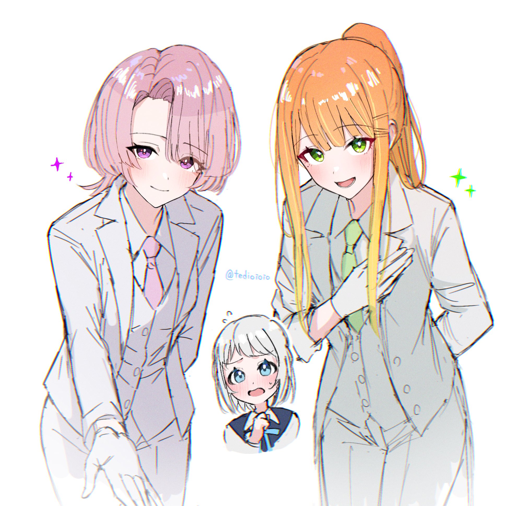 3girls alternate_costume arimura_mao asymmetrical_bangs beckoning blush butler commentary_request crossdressing crossdressing_(ftm) female_butler female_pov flying_sweatdrops formal_clothes gakuen_idolmaster gloves grey_hair highres idolmaster implied_yuri katsuragi_lilja looking_at_viewer multiple_girls orange_hair pink_hair ponytail pov shiun_sumika sidelocks simple_background sparkle suit tedioioio twitter_username white_background white_gloves white_suit