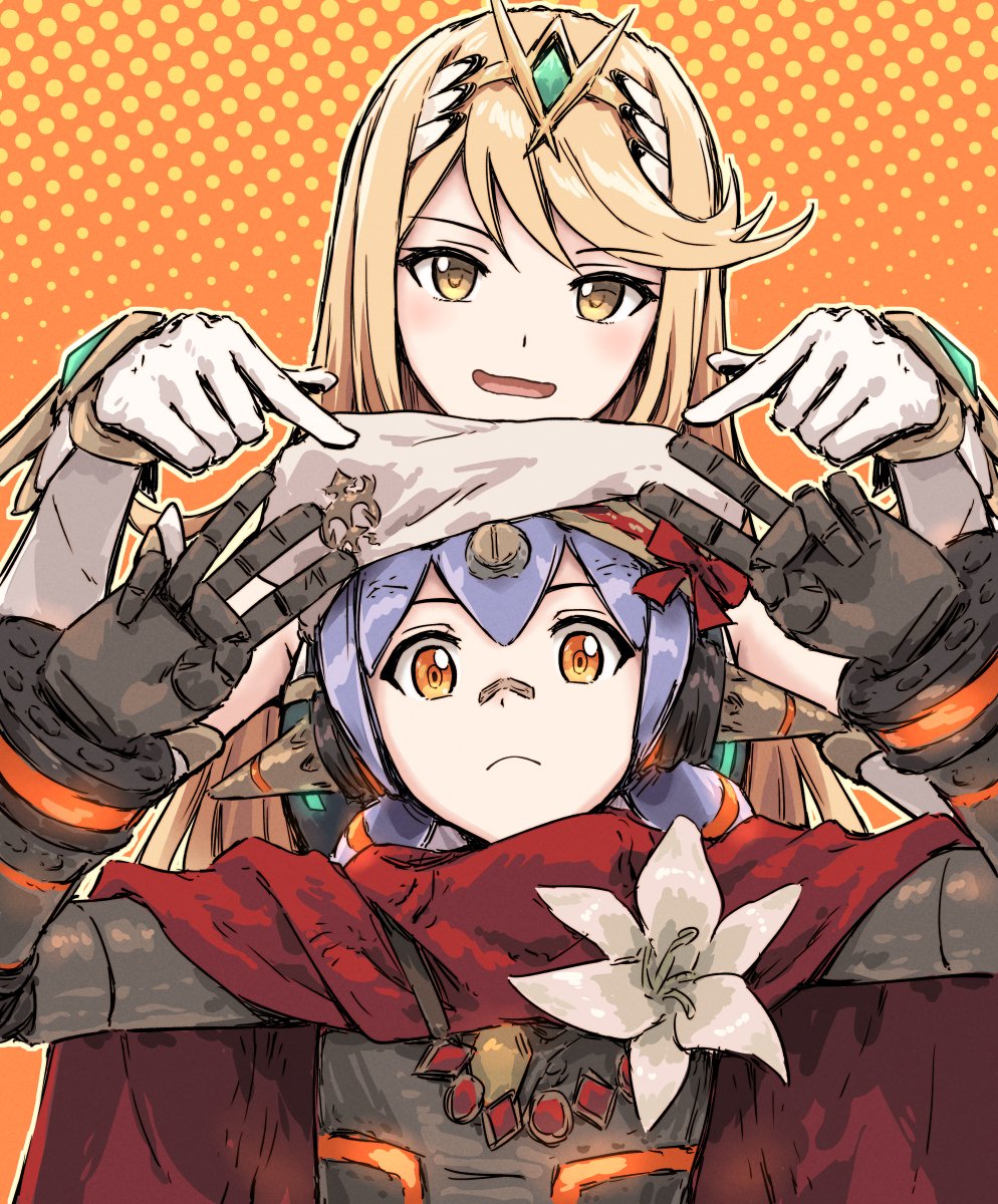 2girls android arms_up blonde_hair blue_hair cape closed_mouth elbow_gloves flower frown gloves gold_tiara hair_between_eyes halftone halftone_background highres index_finger_raised lily_(flower) long_hair looking_at_viewer low_twintails multiple_girls mythra_(xenoblade) open_mouth orange_background orange_eyes outline poppi_(xenoblade) poppi_alpha_(xenoblade) red_cape scarf short_hair smile swept_bangs tiara twintails v very_long_hair w white_flower white_gloves white_scarf xenoblade_chronicles_(series) xenoblade_chronicles_2 yellow_eyes yellow_outline yukitake_(bullfalk)