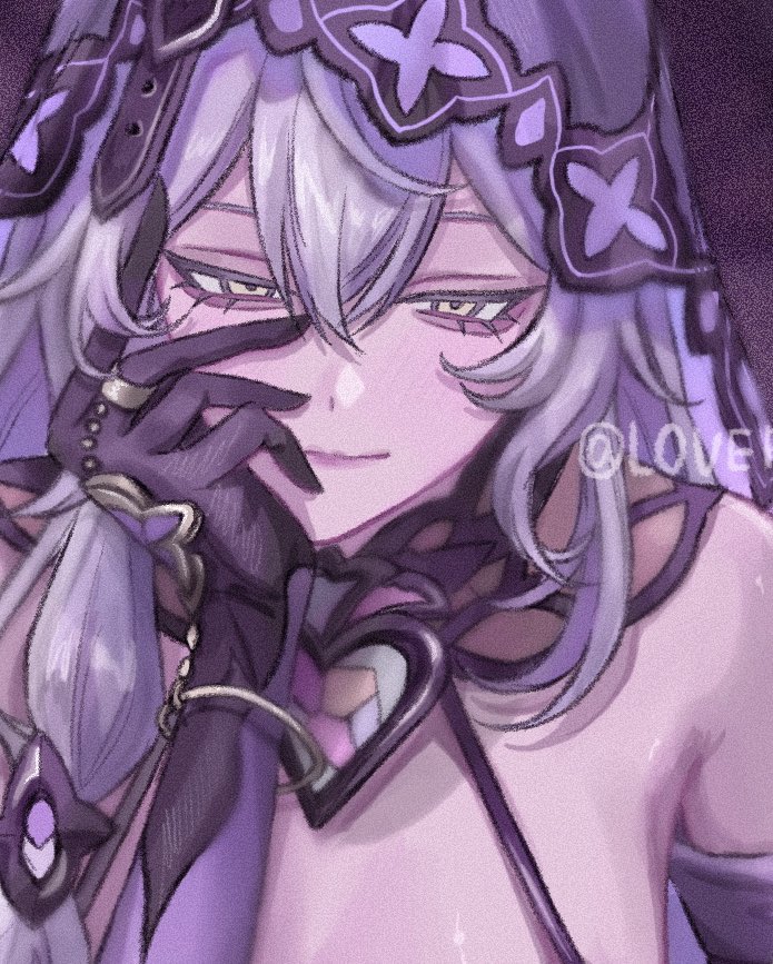 1girl bare_shoulders black_swan_(honkai:_star_rail) closed_mouth commentary cropped elbow_gloves gloves hair_between_eyes half-closed_eyes head_rest honkai:_star_rail honkai_(series) l0ver_t_t purple_gloves purple_hair purple_veil solo veil