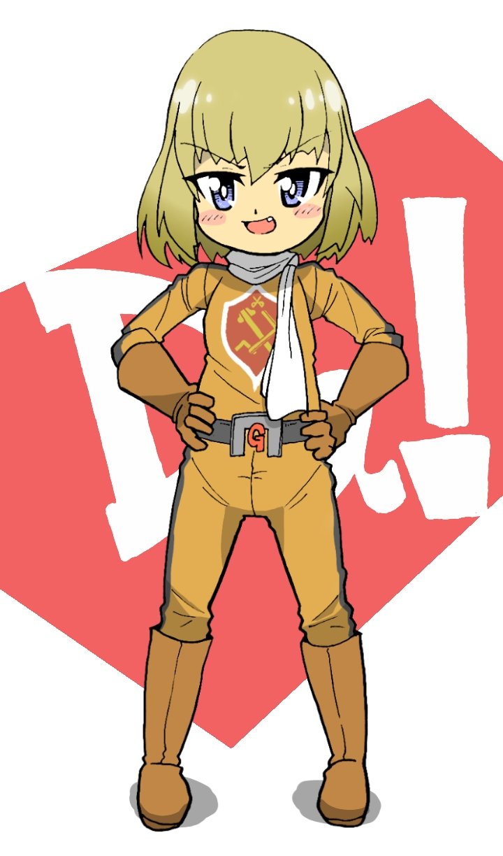 1girl battle_fever_j blonde_hair blue_eyes blush boots cosplay emblem gloves hands_on_own_hips highres katyusha_(girls_und_panzer) long_sleeves looking_at_viewer open_mouth orange_boots orange_gloves orange_suit pravda_(emblem) scarf short_hair simple_background smile solo standing suit super_sentai teeth white_scarf yamakake_(tororo1293)