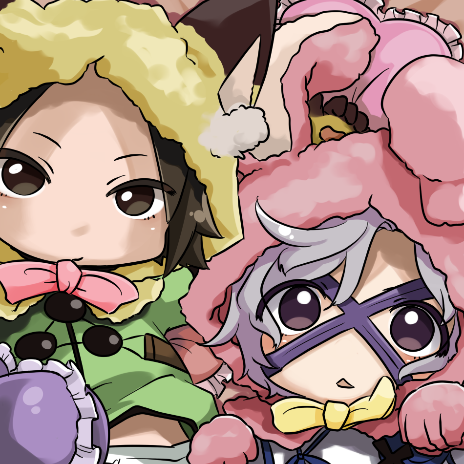 2boys animal_ear_hood animal_ears brown_eyes brown_hair chibi chibi_only eye_mask fake_animal_ears grey_hair hood looking_at_viewer male_focus mask mouri_motonari_(sengoku_basara) multiple_boys open_mouth purple_eyes purple_mask purutonppp rabbit_ears sengoku_basara takenaka_hanbee_(sengoku_basara) triangle_mouth