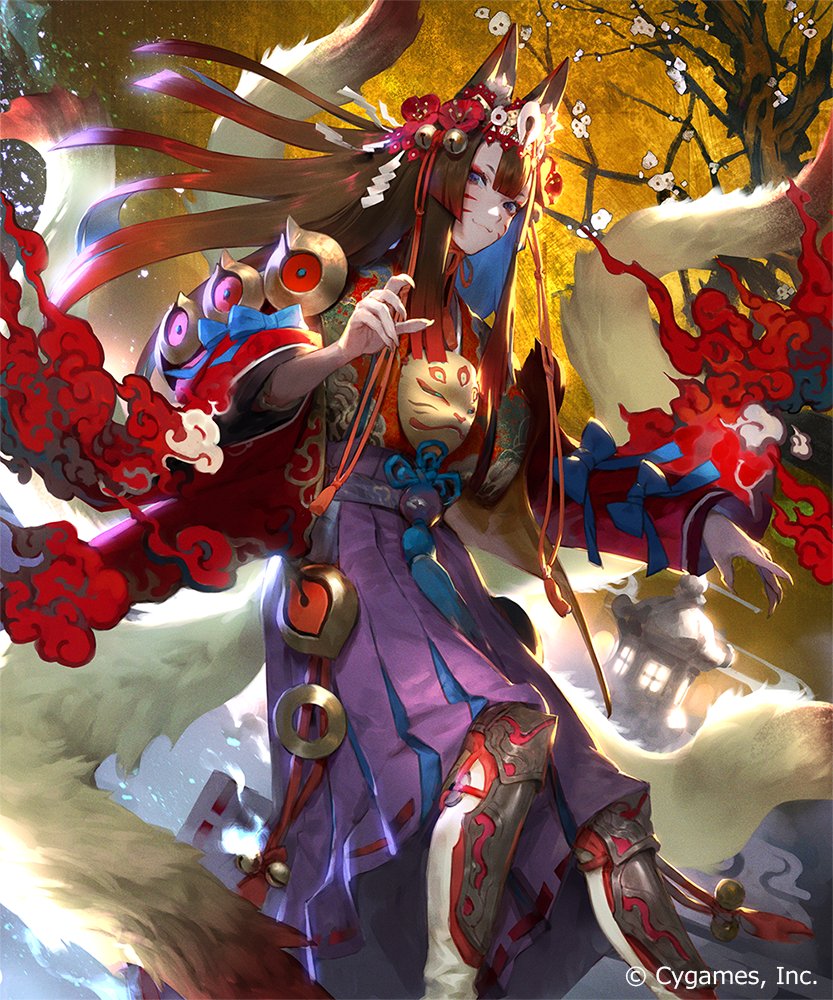 1girl 2others animal_ears bell breasts brown_eyes brown_hair building center-flap_bangs commentary_request company_name day facial_tattoo flower fox fox_ears fox_girl fox_tail ginsetsu_(shadowverse) hair_bell hair_flower hair_ornament japanese_clothes kimono kitsune long_hair long_skirt long_sleeves looking_at_viewer magic mask multiple_others multiple_tails nanbo_ataru_(attall) official_art outdoors purple_skirt red_flower red_kimono shadowverse skirt sky smug standing tail tattoo tree unworn_mask wide_sleeves