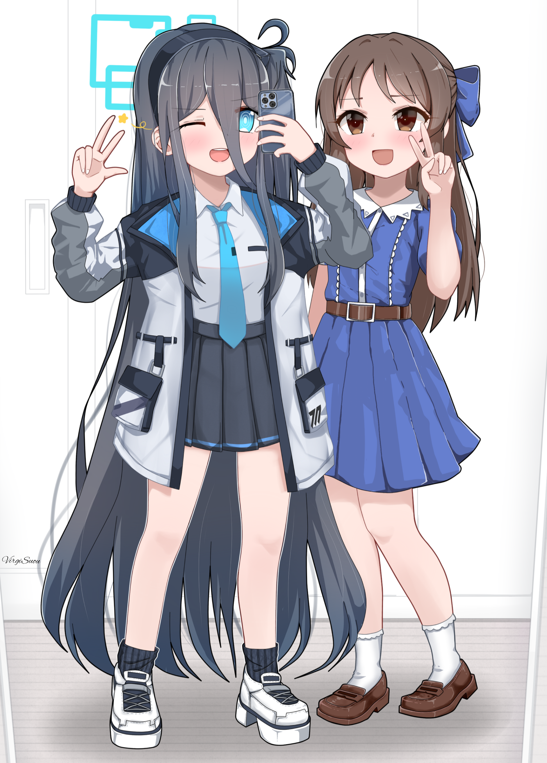 2girls :d ;d absurdres aris_(blue_archive) black_hair black_skirt blue_archive blue_dress brown_hair crossover dress full_body hair_between_eyes half_updo halo highres idolmaster idolmaster_cinderella_girls long_hair long_hair_between_eyes looking_at_viewer multiple_girls name_connection one_eye_closed one_side_up open_mouth phone pleated_skirt shirt skirt smile tachibana_arisu user_spdw4234 v very_long_hair w white_shirt