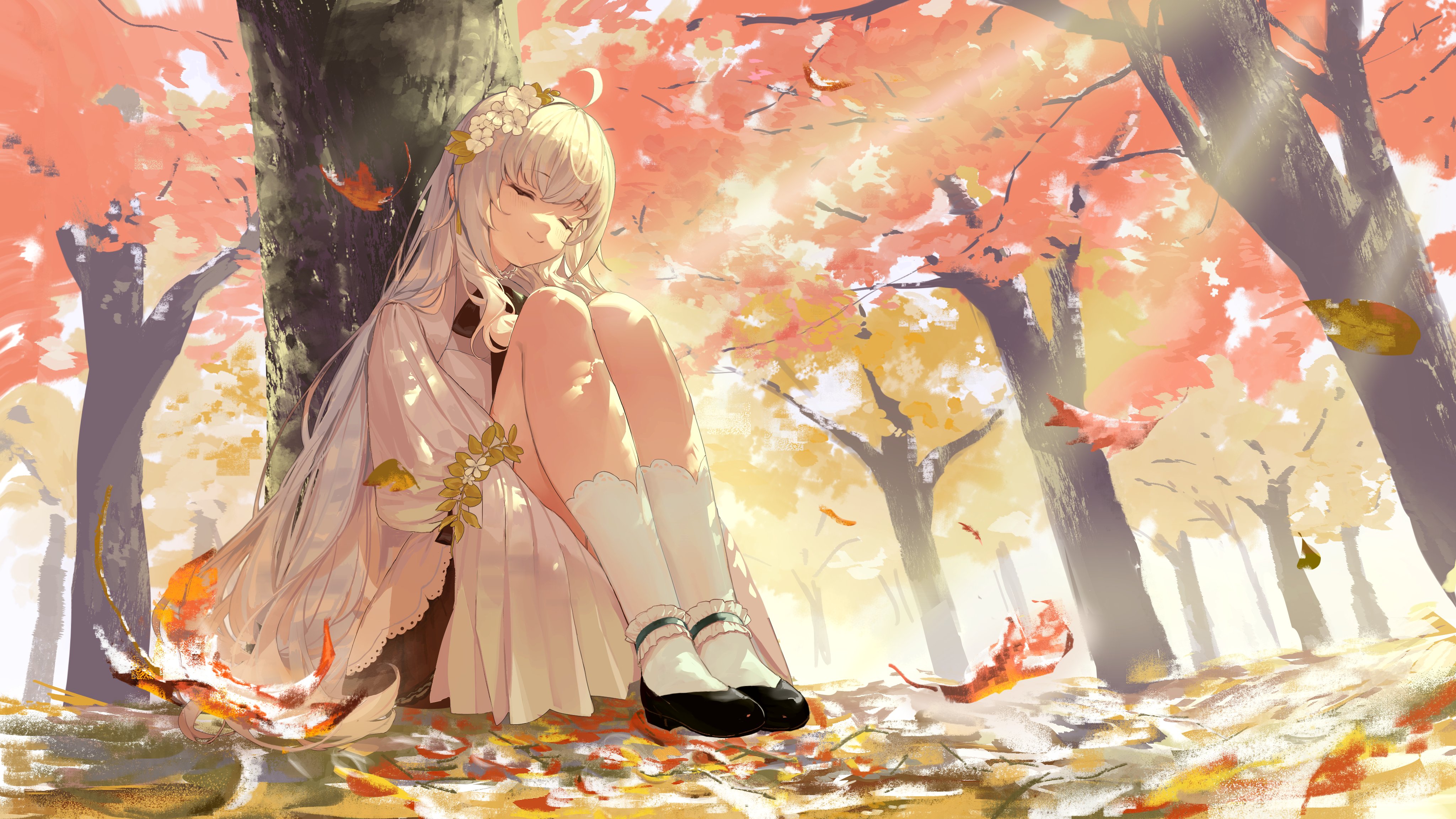 absurdres autumn autumn_leaves closed_eyes falling_leaves flower forest frilled_sleeves frills hair_flower hair_ornament highres indie_virtual_youtuber leaf long_hair nature shoes sleeping smile socks sofieru sofieru_(artist) white_hair white_socks