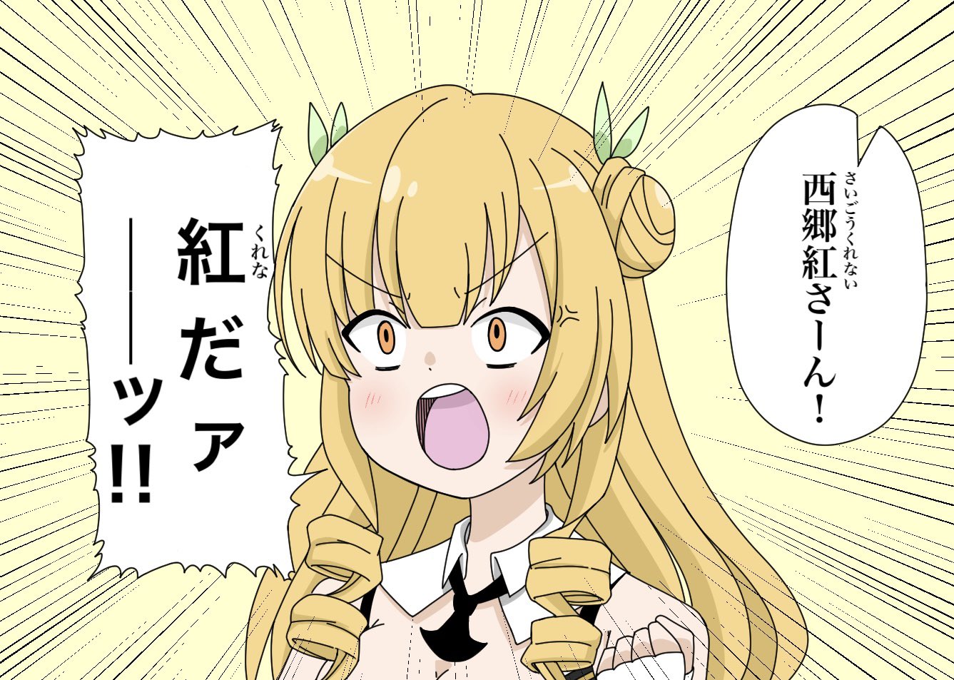 1girl anger_vein angry arm_at_side assault_lily bare_shoulders black_necktie black_shirt blonde_hair blunt_bangs blush breasts cleavage commentary_request detached_collar double_bun drill_hair drill_sidelocks emphasis_lines fingerless_gloves gloves green_ribbon hair_bun hair_ribbon hand_up looking_ahead medium_breasts necktie odaiba_girls_high_school_uniform open_mouth orange_eyes portrait ribbon saigou_kurena school_uniform shirt short_necktie sidelocks simple_background sleeveless sleeveless_shirt solo speech_bubble teeth translated unu_(yayoinoasagohan) upper_teeth_only v-shaped_eyebrows white_gloves yellow_background