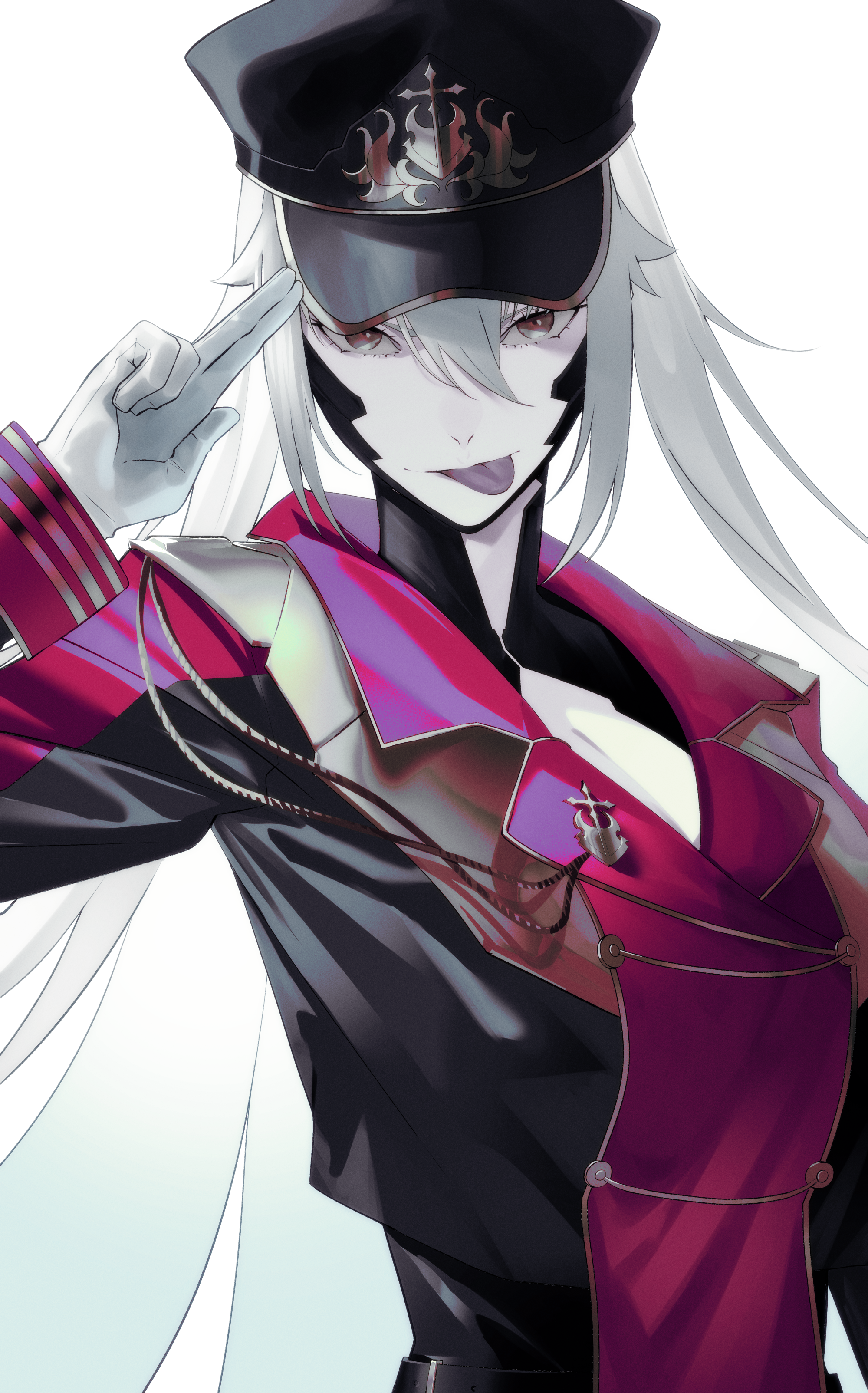 1girl absurdres black_hat commentary english_commentary gloves hair_between_eyes hat highres kuroi_enpitsu long_hair solo tongue tongue_out virtual_youtuber vshojo white_gloves white_hair zentreya zentreya_(commander)