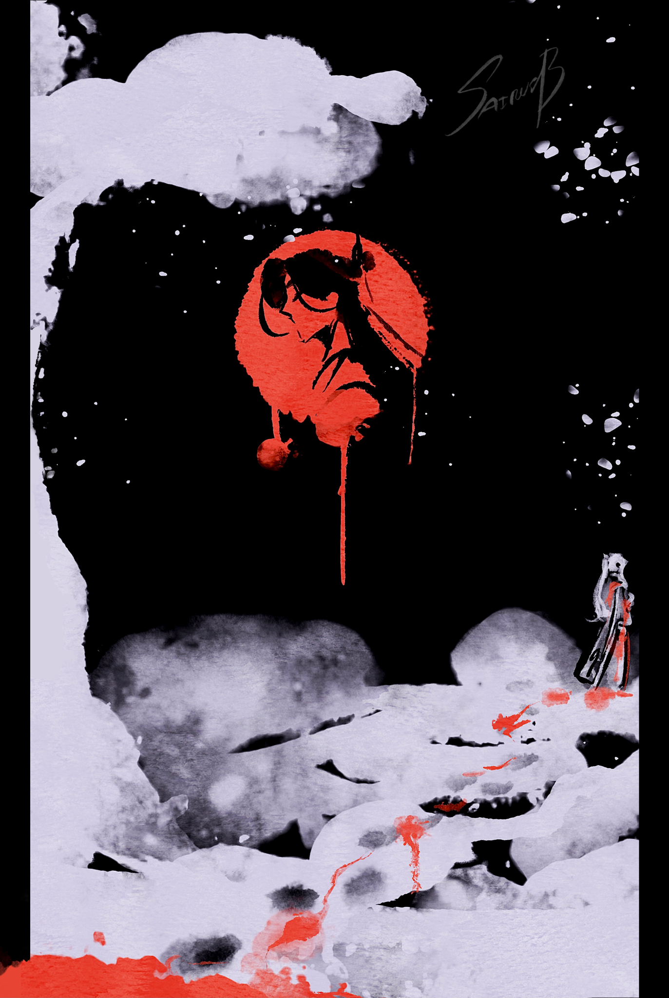 2boys black_background black_hair black_sky blood blood_on_clothes blood_on_ground chinese_clothes closed_eyes commentary dripping english_commentary footprints from_behind highres ice liu_qingge long_hair monochrome multiple_boys night painterly pillarboxed ponytail portrait profile red_sun red_theme renzha_fanpai_zijiu_xitong ribboned_xiao_guan sairusb shen_qingqiu signature sky snow snowing standing symbolism white_hair wide_shot winter xiao_guan_(headdress)