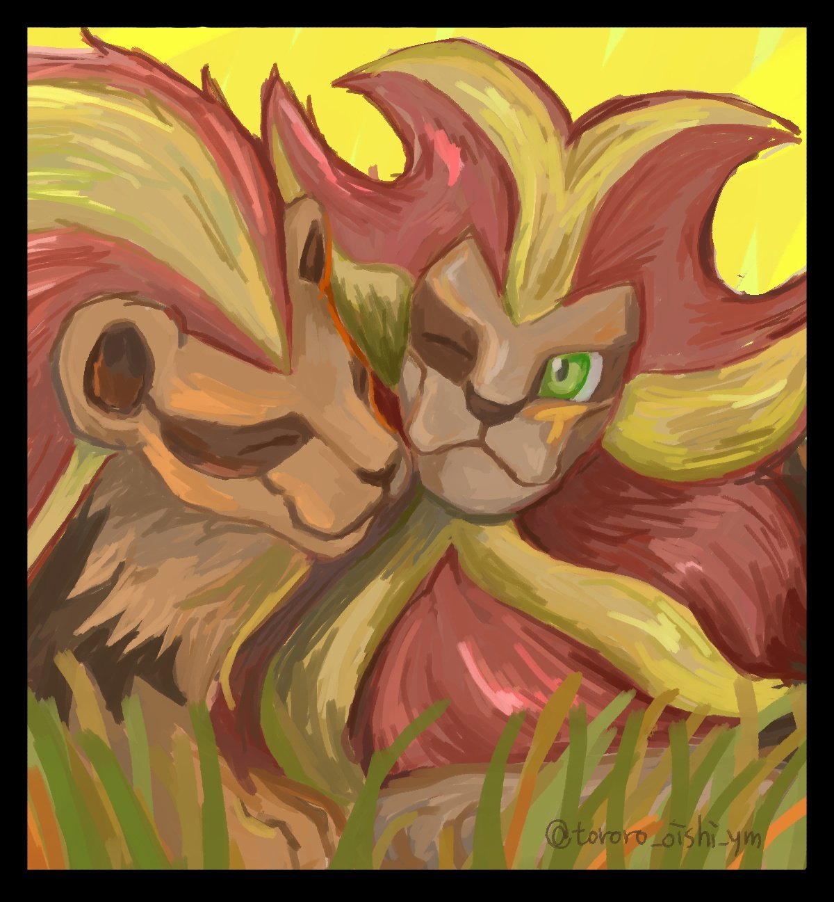 ^_^ black_border border brown_fur closed_eyes gen_6_pokemon grass green_eyes highres multicolored_fur nintendo no_humans nuzzle one_eye_closed pokemon pokemon_(creature) pokemon_focus pyroar pyroar_(female) pyroar_(male) red_fur tororo_oishi_ym twitter_username yellow_fur
