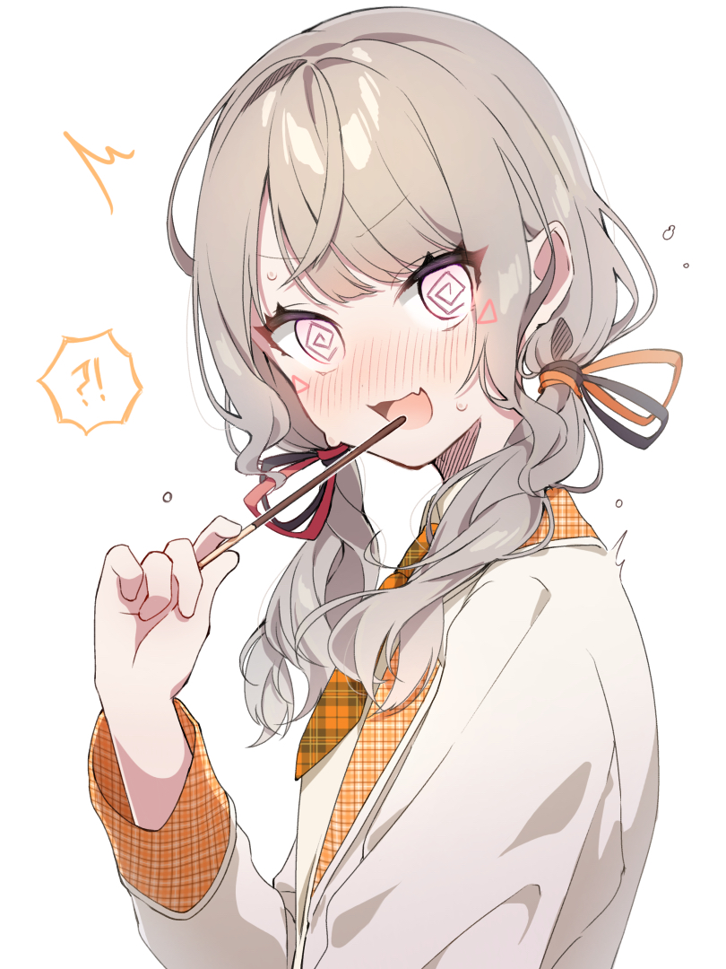 !? 1girl :3 @_@ ^^^ arm_at_side black_ribbon blush brown_coat coat commentary_request embarrassed facial_mark fang flustered flying_sweatdrops food from_side furrowed_brow grey_hair hair_over_shoulder hair_ribbon hand_up holding holding_food holding_pocky komori_met komori_met_(6th_costume) long_hair long_sleeves looking_at_viewer mark_under_both_eyes nea_369 necktie nervous_sweating nose_blush official_alternate_costume official_alternate_hairstyle open_mouth orange_ribbon plaid_clothes plaid_necktie pocky pocky_day red_ribbon ribbon short_necktie sidelocks simple_background skin_fang solo spoken_interrobang surprised sweat swept_bangs triangle triangle_facial_mark turning_head twintails upper_body v-shaped_eyebrows virtual_youtuber vspo! white_background