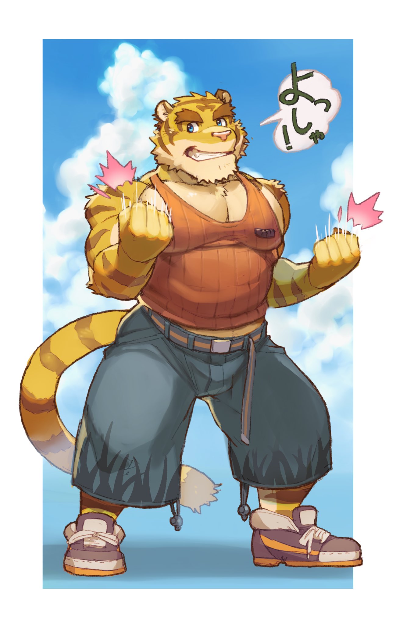 1boy animal_ears black_footwear blue_eyes blue_pants animal_nose clenched_hands cloud cloudy_sky collarbone commentary_request fangs furry furry_male gamma_dh grin highres looking_at_viewer male_focus morenatsu muscular muscular_male pants pectoral_cleavage pectorals red_tank_top sky smile speech_bubble tail tank_top thick_eyebrows tiger_boy tiger_ears tiger_stripes tiger_tail torahiko_oshima translated yellow_fur