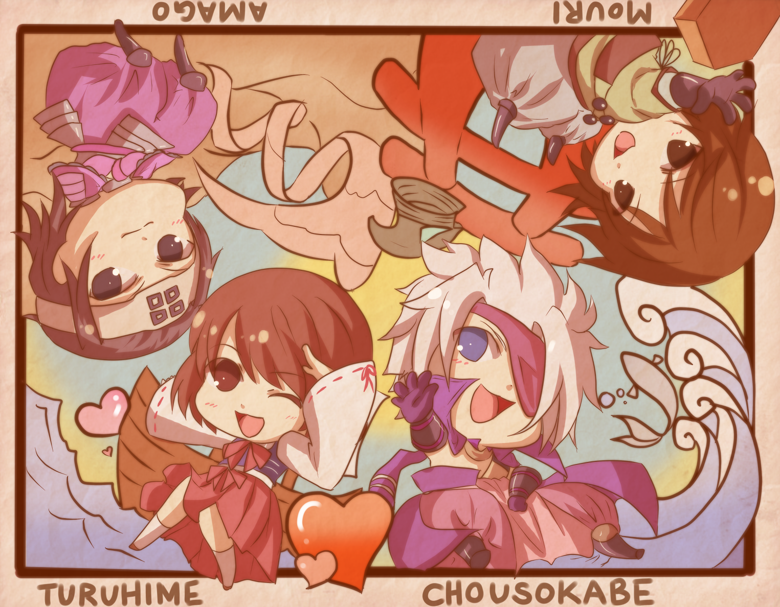 1girl 3boys :d amago_haruhisa_(sengoku_basara) black_eyes black_hair blue_eyes blush brown_eyes brown_hair character_name chibi chibi_only chousokabe_motochika_(sengoku_basara) eyepatch forehead_protector grey_hair hair_between_eyes hakama hakama_skirt heart japanese_clothes looking_at_viewer mouri_motonari_(sengoku_basara) muchiwo multiple_boys one_eye_closed open_mouth pants pink_pants red_hakama rotational_symmetry sengoku_basara sepia short_hair skirt smile tsuruhime_(sengoku_basara) unworn_headwear white_pants