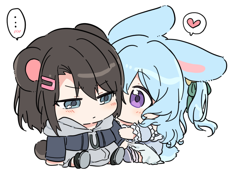 ... 2girls animal_ears bang_dream! bang_dream!_girls_band_party! bear_ears bear_girl bear_tail black_hair black_jacket black_shorts blue_eyes blue_hair blue_shirt clothes_writing cropped_jacket full_body green_ribbon grey_hoodie grey_skirt hair_ornament hair_ribbon hairclip half-closed_eyes heart hood hood_down hoodie hug jacket jitome kemonomimi_mode light_blue_hair long_hair long_hoodie looking_at_another matsubara_kanon medium_hair multiple_girls okusawa_misaki one_side_up open_clothes open_jacket opi purple_eyes rabbit_ears rabbit_girl rabbit_tail ribbon shirt shorts simple_background sitting skirt speech_bubble spoken_ellipsis spoken_heart tail white_background yuri