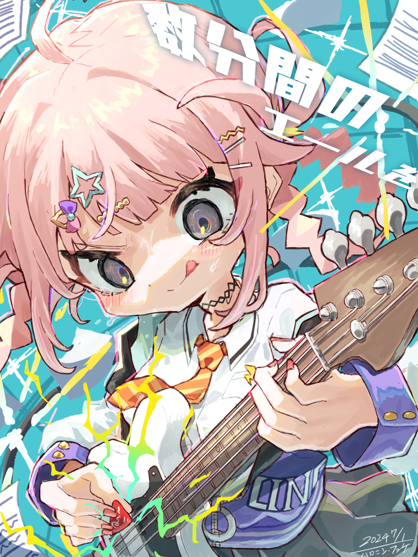 1girl ahoge bass_guitar black_skirt blue_background blush braid collared_shirt hair_ornament hairclip haronin_fukke holding holding_instrument holding_plectrum instrument jacket long_hair long_sleeves music necktie open_clothes open_jacket orange_necktie pink_hair playing_instrument pleated_skirt plectrum shirt signature skirt solo star_(symbol) star_hair_ornament suufunkan_no_yell_wo tongue tongue_out twin_braids white_shirt
