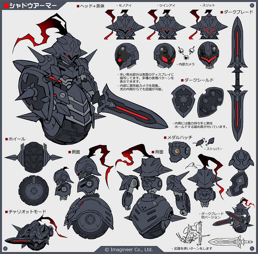 1boy armor black_armor black_helmet character_name concept_art double_blade helmet holding holding_shield holding_sword holding_weapon k-suwabe medarot medarot_survivor official_art red_eyes reference_sheet robot shadow_armor_(medarot) shield sword weapon