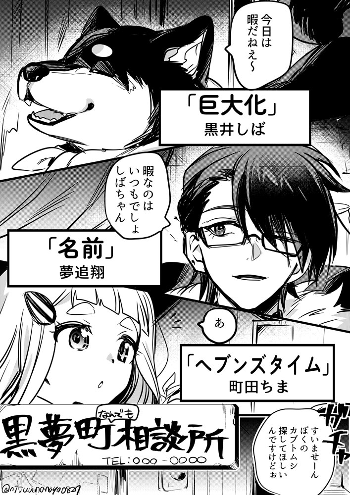 1boy 1girl animal animal_ear_fluff character_request dog fur_trim glasses greyscale hair_ornament hair_over_one_eye kuroi_shiba machita_chima monochrome nijisanji ninahachi parted_lips seed short_eyebrows sunflower_seed thick_eyebrows translation_request twitter_username virtual_youtuber yumeoi_kakeru yumeoi_kakeru_(3rd_costume)