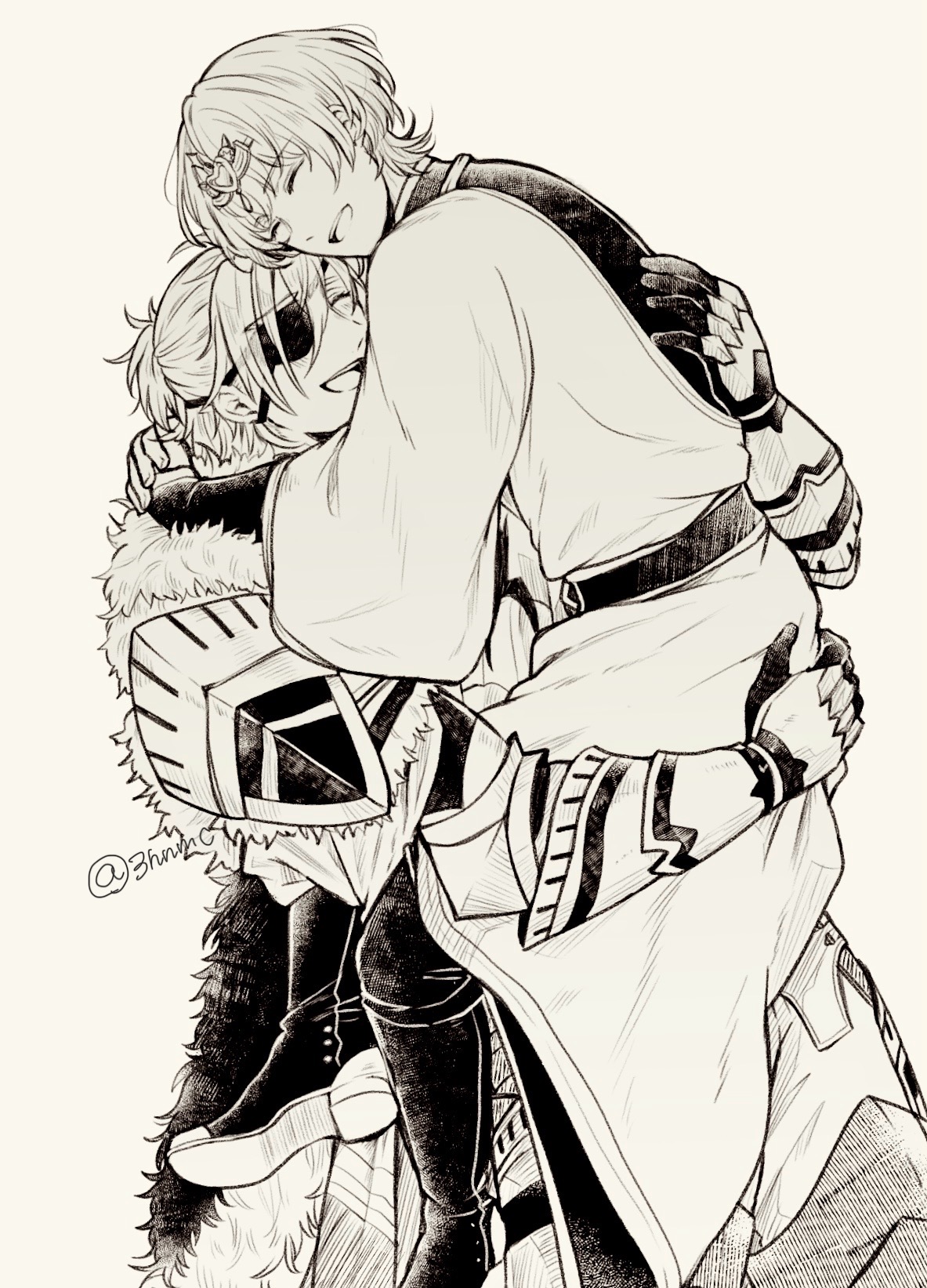 2boys 3hnmc affectionate armor arms_around_neck boots bridal_gauntlets cape carrying carrying_person commentary_request couple dimitri_alexandre_blaiddyd dimitri_alexandre_blaiddyd_(timeskip) eyepatch fire_emblem fire_emblem:_three_houses fur-trimmed_cape fur_trim gauntlets gloves hand_on_another's_back highres long_sleeves male_byleth_(awakened)_(fire_emblem) male_byleth_(fire_emblem) male_byleth_(enlightened_one)_(fire_emblem) male_focus multiple_boys nintendo one_eye_covered open_mouth pauldrons ponytail robe short_hair short_ponytail shoulder_armor simple_background tiara twitter_username white_background wide_sleeves wolf_cut yaoi