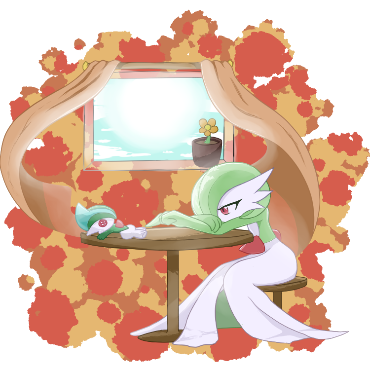 bob_cut chair colored_skin curtains dress from_side gallade gardevoir gen_3_pokemon gen_4_pokemon green_hair green_skin masking multicolored_skin nintendo on_chair pink_eyes plant pokemon pokemon_(creature) potted_plant sitting stuffed_toy table two-tone_skin white_dress white_skin window