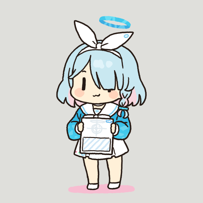 1girl :3 arona_(blue_archive) blue_archive blue_hair blue_halo blue_shirt blush_stickers bow bow_hairband braid chibi chibi_only closed_mouth colored_inner_hair commentary_request envelope full_body grey_background hair_bow hair_over_one_eye hairband halo holding holding_envelope long_sleeves medium_hair multicolored_hair no_nose onyhakase parted_bangs pink_hair recruitment_(blue_archive) sailor_collar school_uniform serafuku shirt side_braid simple_background single_braid skirt smile solo standing two-tone_hair white_bow white_footwear white_hairband white_sailor_collar white_skirt |_|