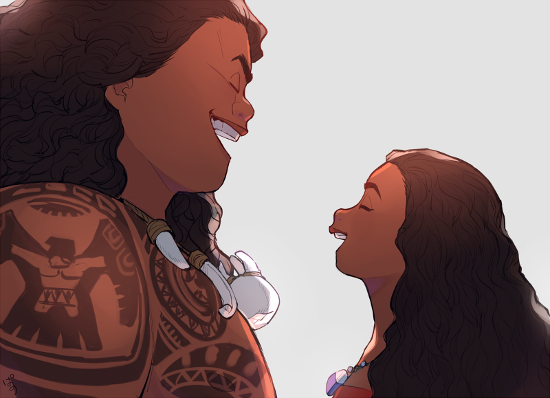 1boy 1girl arm_tattoo brown_hair chest_tattoo dark-skinned_female dark-skinned_male dark_skin from_side long_hair maui_(moana) moana_(movie) moana_waialiki open_mouth outdoors pano_(mohayayamai) simple_background tattoo teeth tribal_tattoo upper_body upper_teeth_only white_background
