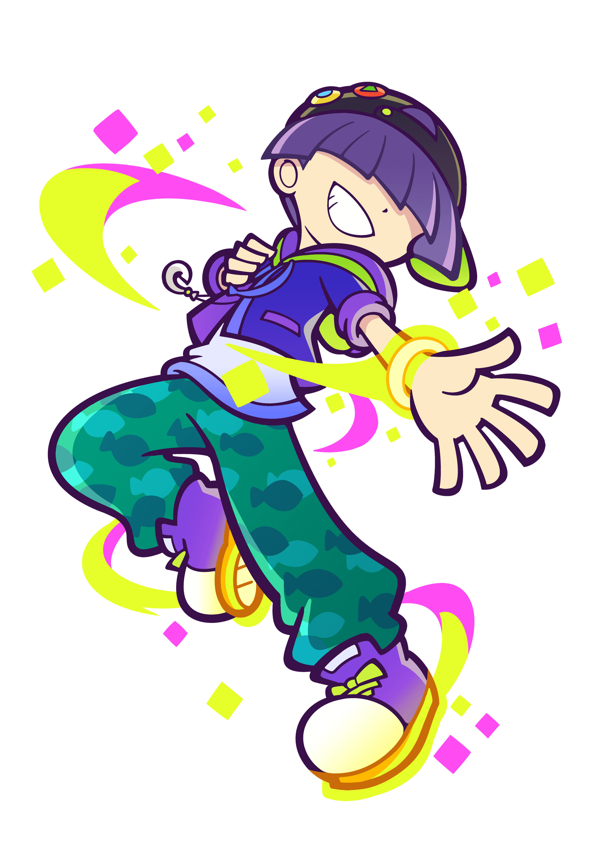 1boy :d absurdres animal_print backwards_hat badge baseball_cap black_hat blunt_bangs blunt_ends bracelet button_badge covered_eyes cropped_hoodie deformed drawstring facing_back fish_print foreshortening full_body glowing glowing_jewelry glowing_shoe_soles green_pants grin hair_over_eyes hands_on_own_chest happy hat highres hood hoodie jewelry knee_up leaning_back light_trail male_focus necklace official_alternate_costume official_art open_hand open_mouth outstretched_arm pants pendant pocket print_pants purple_hair purple_hoodie purple_shoes purple_trim puyopuyo puyopuyo_quest sasaki_maguro shirt shoes short_hair short_sleeves simple_background smile sneakers solo sparkle standing standing_on_one_leg third-party_source transparent_background unmoving_pattern white_shirt