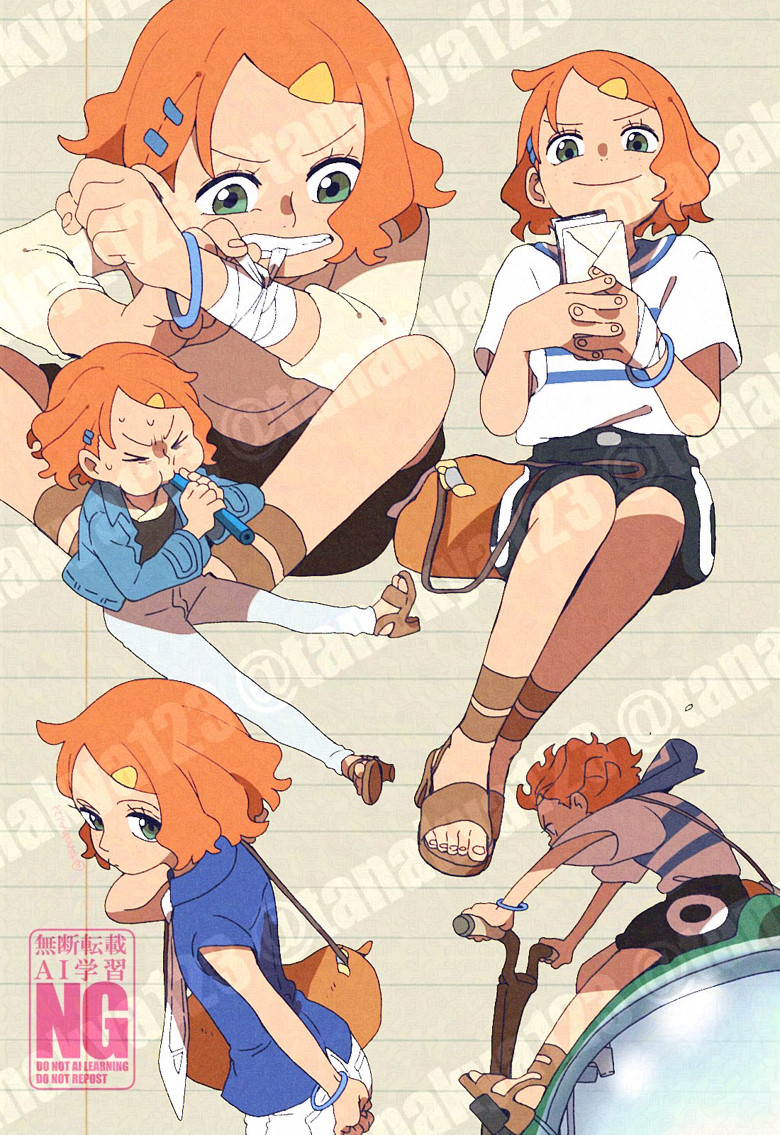 >_< 1girl bag bandaged_arm bandages bangle black_shorts blue_jacket blue_shirt bracelet closed_eyes closed_mouth commentary_request green_eyes hair_ornament hairclip highres holding holding_letter jacket jewelry letter multiple_views nami's_fangirl necktie one_piece one_piece_fan_letter open_clothes open_jacket orange_hair pants riding sandals shirt short_hair short_sleeves shorts shoulder_bag sitting smile sweat tanaka_(tanakya123) toes watermark wavy_hair white_necktie white_pants