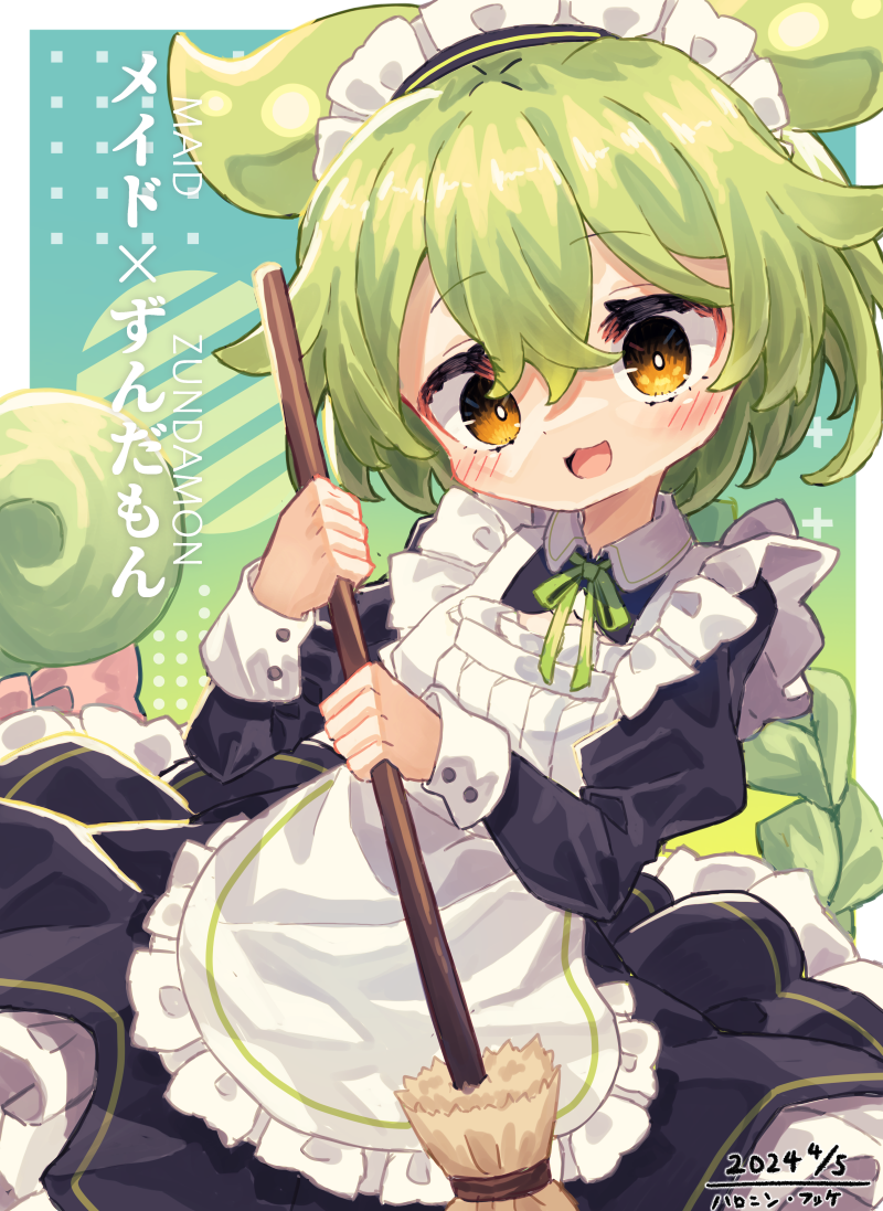 1girl :d apron black_dress blush commentary_request dated dress green_hair haronin_fukke holding holding_mop long_hair long_sleeves looking_at_viewer maid maid_apron mop open_mouth smile solo voicevox white_apron yellow_eyes zundamon