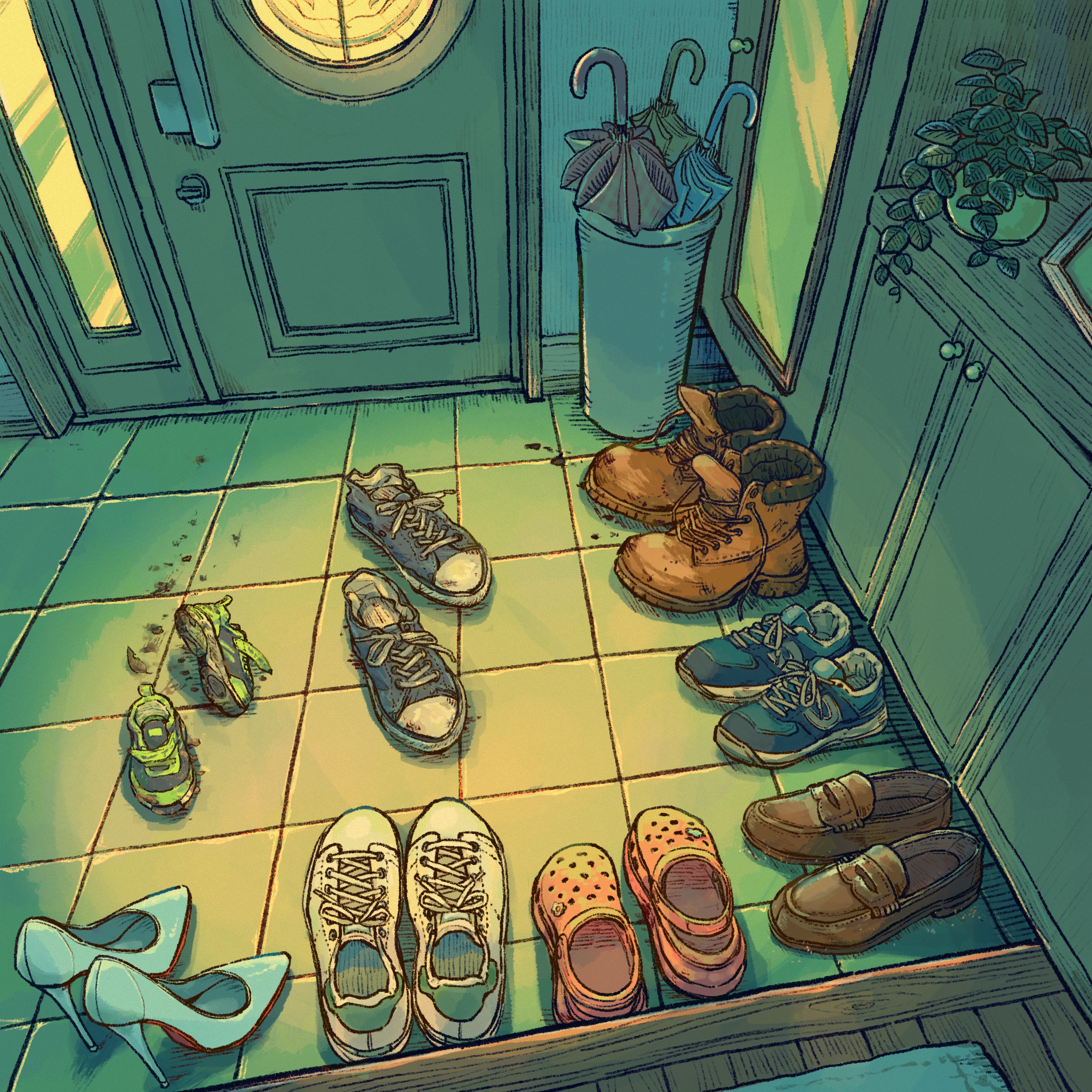 absurdres boots brown_footwear crocs door entrance high_heels highres loafers no_humans original plant port_(portzzz) potted_plant procreate_(medium) scenery shoes sneakers umbrella white_footwear