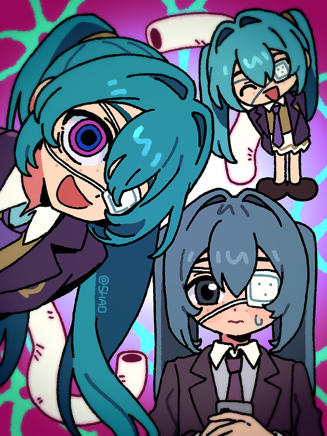 1girl abstract_background blue_hair blue_necktie brown_jacket brown_necktie collared_shirt eyepatch full_body hatsune_miku highres jacket long_hair looking_at_viewer medical_eyepatch monitoring_(vocaloid) multiple_views necktie open_mouth ringed_eyes school_uniform shao_(shaorouhong) shirt smile twintails very_long_hair vocaloid white_shirt