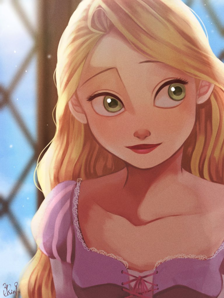 1girl blonde_hair collarbone dress green_eyes light_smile long_hair looking_to_the_side portrait purple_dress rapunzel_(disney) red_lips riri_adventure solo tangled