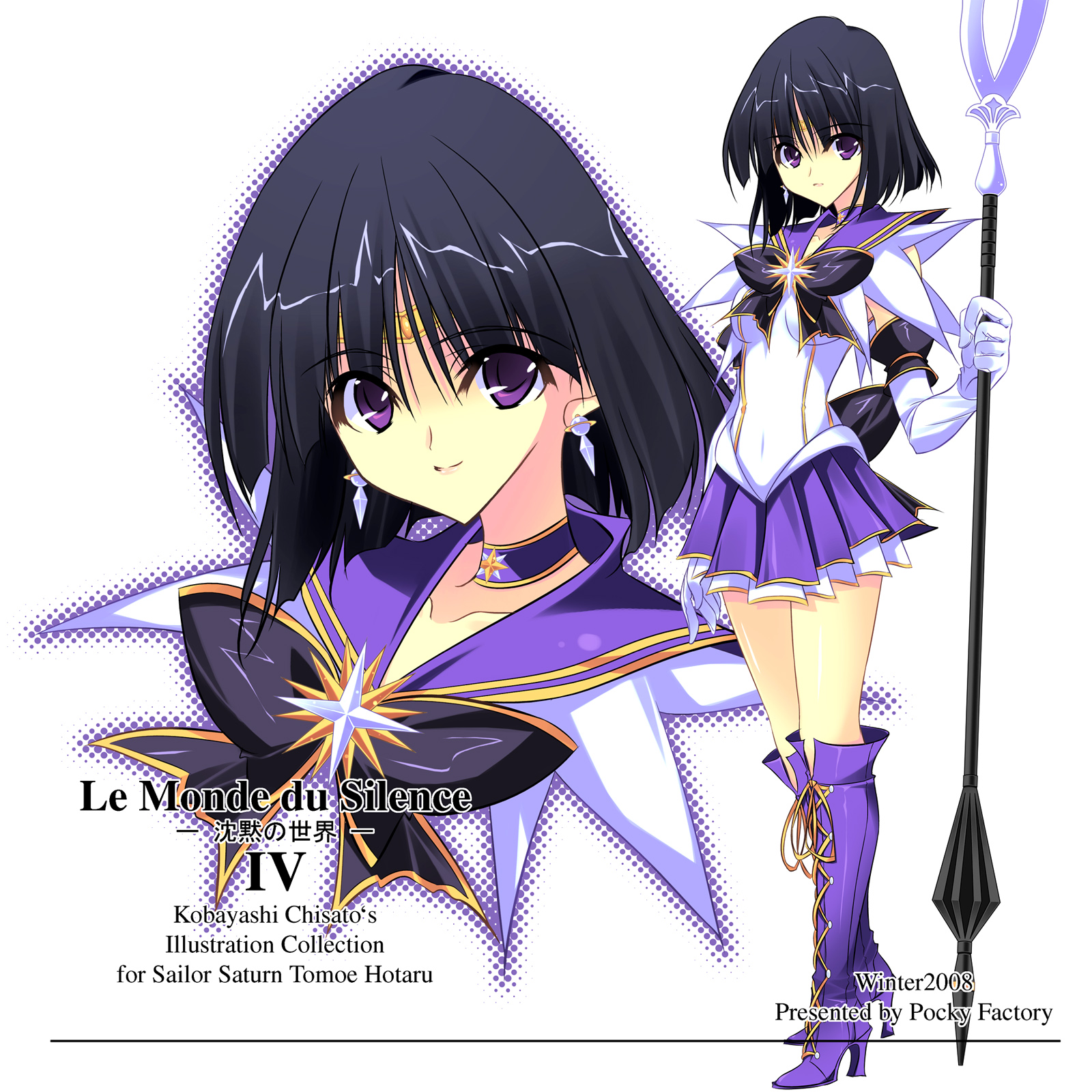00s 1990s_(style) 1girl 2008 bishoujo_senshi_sailor_moon black_bow black_hair bob_cut boots bow brooch character_name choker dual_persona earrings elbow_gloves full_body glaive_(polearm) gloves highres holding holding_polearm holding_spear holding_weapon jewelry knee_boots kobayashi_chisato lace-up_boots magical_girl multiple_views pleated_skirt polearm purple_eyes purple_footwear purple_skirt retro_artstyle ribbon sailor_collar sailor_moon_musical sailor_saturn short_hair silence_glaive simple_background skirt smile spear star_(symbol) star_brooch tiara tomoe_hotaru weapon white_background white_gloves