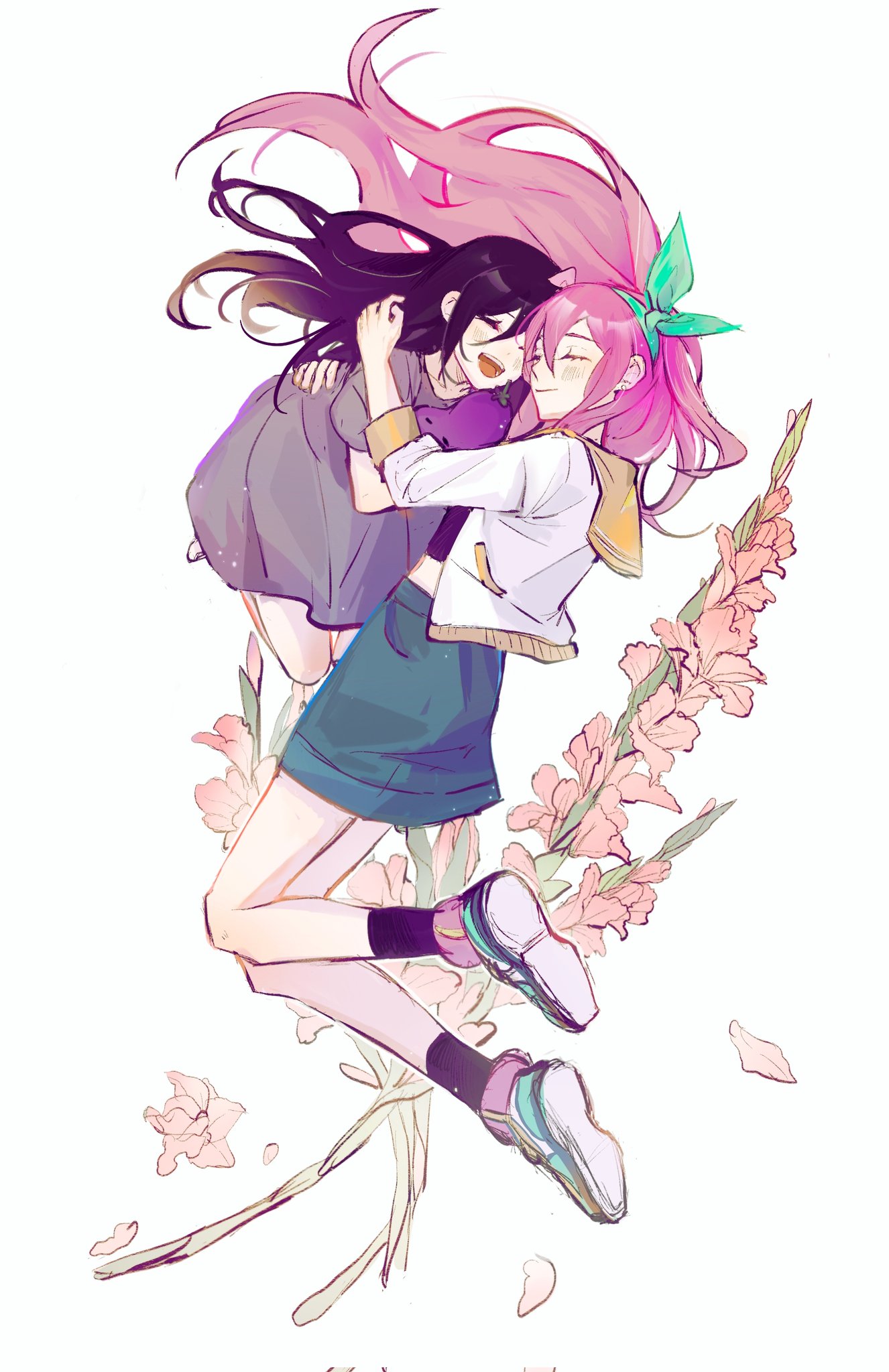 2girls :d ^_^ ankle_socks aubrey_(faraway)_(omori) aubrey_(headspace)_(omori) aubrey_(omori) black_hair black_socks blue_skirt bow bow_hairband closed_eyes closed_mouth commentary denim denim_skirt double-parted_bangs dress dual_persona facing_another floating floating_hair flower full_body gladiolus green_footwear green_hairband grey_dress hair_between_eyes hair_bow hairband highres holding holding_stuffed_toy hug jacket knees_together_feet_apart long_hair miniskirt mr._plantegg_(omori) multiple_girls niutoutou omori open_mouth pink_bow pink_flower pink_hair sailor_collar shoes short_sleeves simple_background skirt smile sneakers socks stuffed_eggplant stuffed_toy untranslatable_commentary teeth tongue white_background white_jacket yellow_sailor_collar