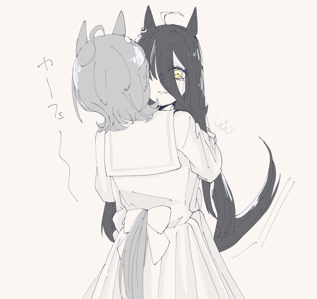 agnes_tachyon_(umamusume) ahoge animal_ears blush bow chemical_structure closed_mouth commentary_request ear_tag earrings frown hair_between_eyes highres horse_ears horse_girl horse_tail hug jewelry long_bangs long_hair long_hair_between_eyes long_sleeves manhattan_cafe_(umamusume) medium_hair motion_lines partial_commentary partially_colored pleated_skirt sad sailor_collar school_uniform shirt single_earring skirt solo tail tccf41335 tearing_up tracen_school_uniform translation_request umamusume very_long_hair waist_bow wolf_cut yellow_eyes