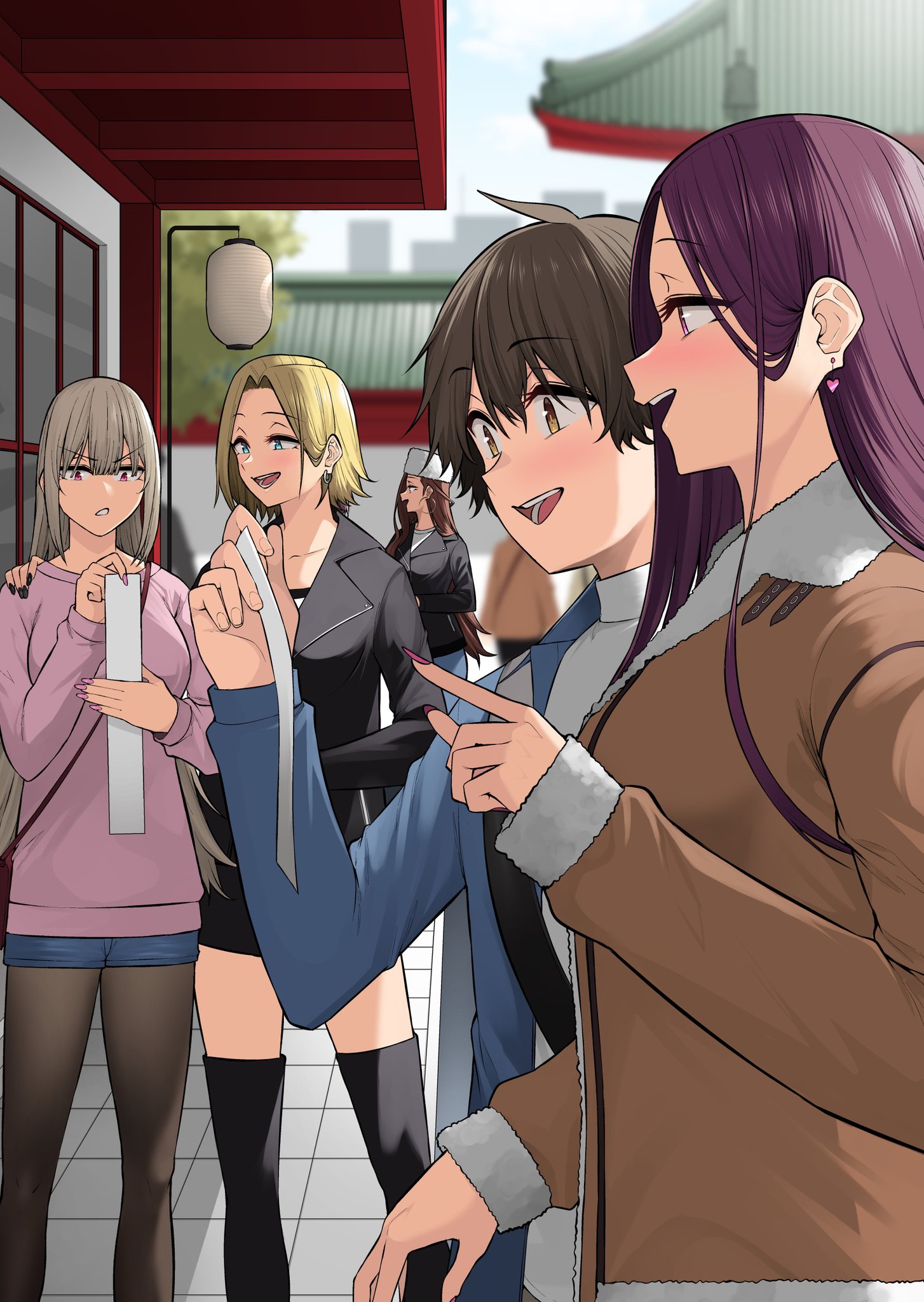 ahoge black_nails blonde_hair blue_eyes brown_eyes brown_hair coat cover_art earrings grey_hair hamazaki's_sister_(imaizumin-chi) hamazaki_lisa hamazaki_reina hand_on_another's_shoulder hatsumoude heart heart_earrings highres imaizumin-chi_wa_douyara_gal_no_tamariba_ni_natteru_rashii imaizumin_keita jewelry kurumizaka_ruri lantern leggings new_year omikuji paper_lantern pink_sweater purple_eyes purple_hair purple_nails sasaki_yukina shorts shrine sweater thighhighs winter_clothes winter_coat