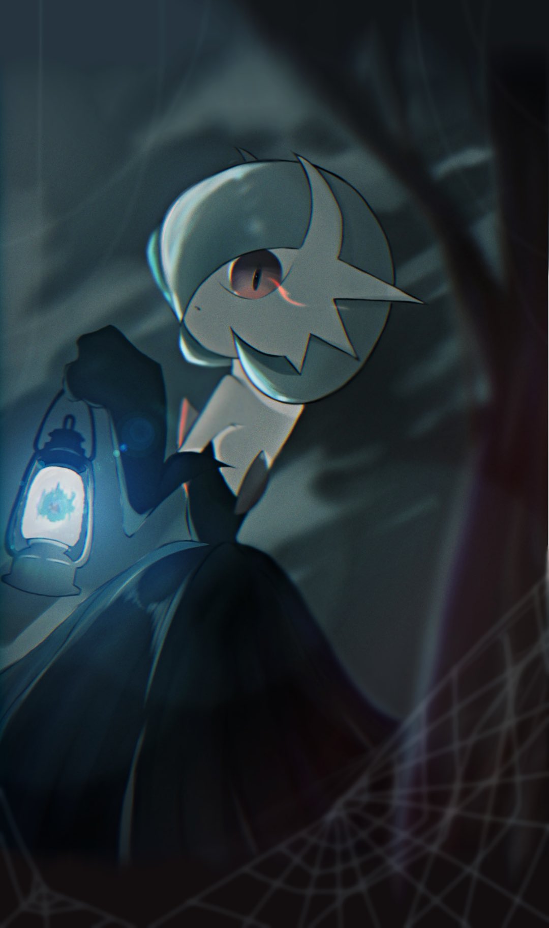 alternate_color black_dress black_gloves blue_hair bob_cut colored_skin commentary_request dress elbow_gloves gardevoir gen_3_pokemon gloves hair_over_one_eye highres holding_lamp lamp looking_back mega_gardevoir mega_pokemon nintendo pink_eyes pokemon pokemon_(creature) rize_(r) shiny_pokemon silk spider_web strapless strapless_dress white_skin