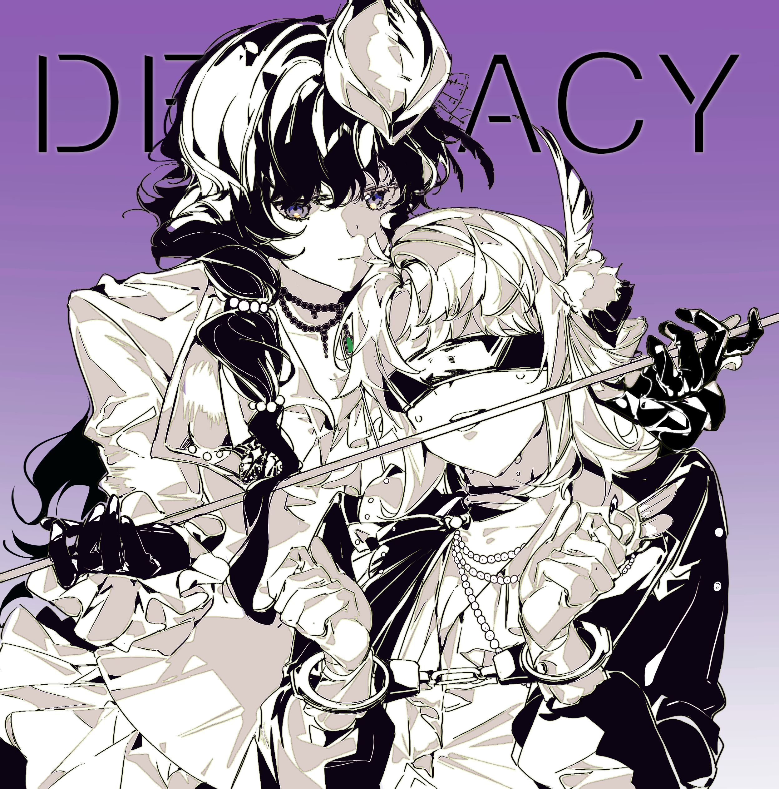 absurdres behind_another blindfold bound bound_wrists cane cuffs feather_hair_ornament feathers gagged gloves gradient_background greyscale_with_colored_background hair_ornament handcuffs hands_up hat highres holding holding_cane isolde_(and_all_that_jazz)_(reverse:1999) isolde_(reverse:1999) jacket kakania_(reverse:1999) kakania_(seminars_on_serenity)_(reverse:1999) long_hair looking_at_viewer purple_background reverse:1999 shirt sweat upper_body yijiao_wuran