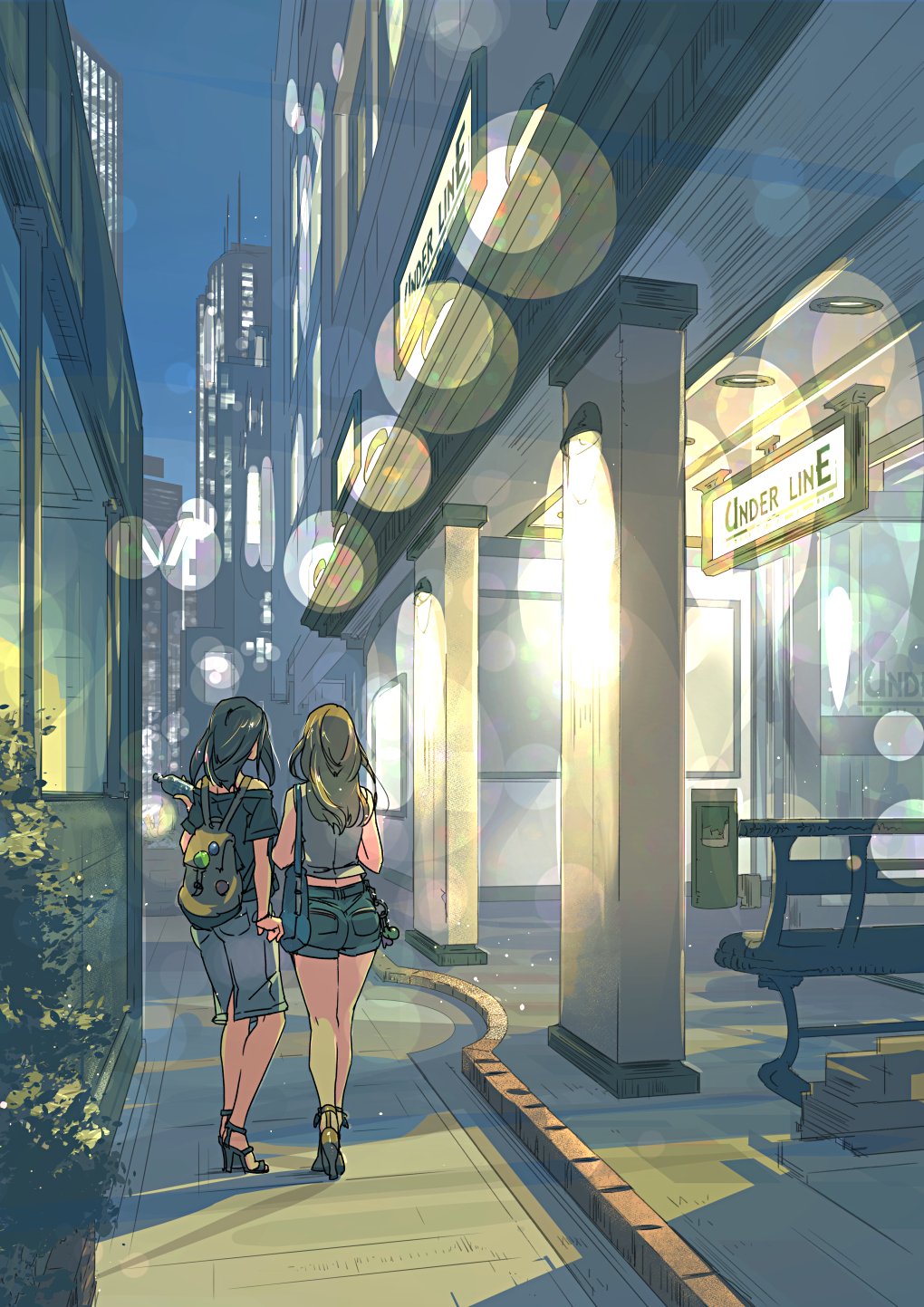 2girls backpack bag bench blurry bokeh bottle building bush city city_lights depth_of_field facing_away high_heels highres holding holding_bottle light_particles long_hair multiple_girls night original outdoors scenery short_shorts shorts sign skyscraper sleeveless supe_(yuusyasupepen) walking