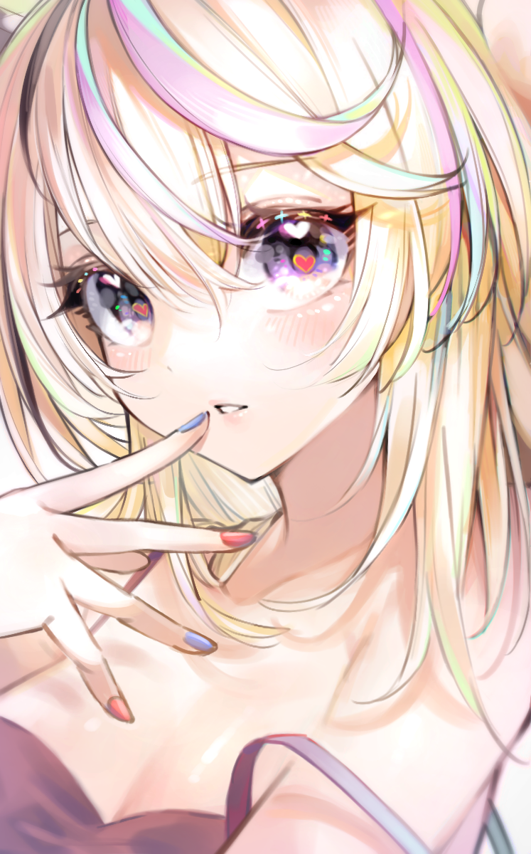 1girl black_camisole blonde_hair blue_nails breasts camisole double-parted_bangs finger_to_mouth hair_between_eyes heart heart-shaped_pupils highres hololive long_hair looking_at_viewer medium_breasts multicolored_hair multicolored_nails nmnkymd omaru_polka parted_lips portrait purple_eyes red_nails solo strap_slip streaked_hair symbol-shaped_pupils virtual_youtuber