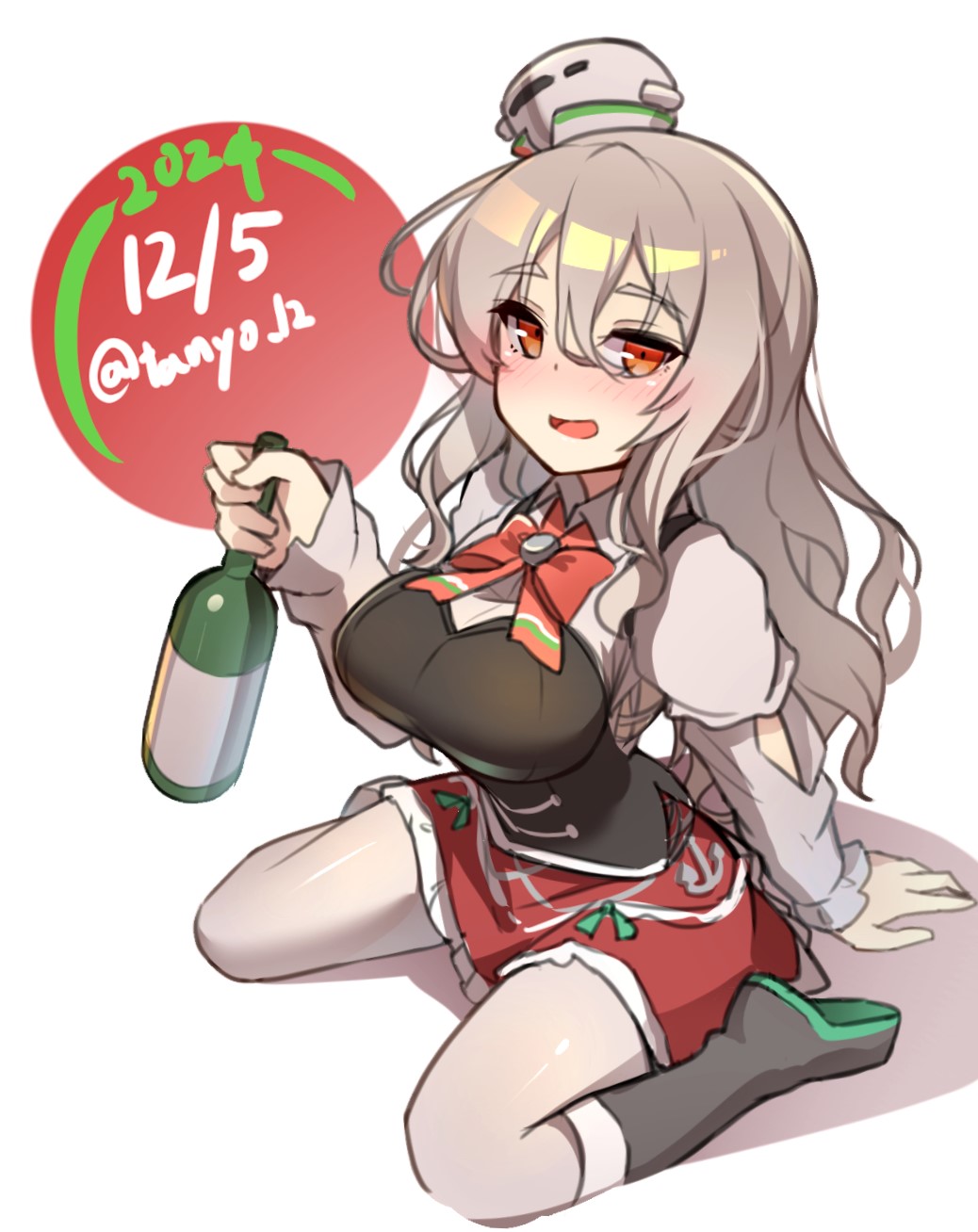 1girl blush bodice boots bottle breasts brown_eyes corset dated drunk grey_hair hair_between_eyes hat highres holding holding_bottle kantai_collection large_breasts long_hair long_sleeves looking_at_viewer mini_hat open_mouth pola_(kancolle) shirt skirt smile solo tanyou thick_eyebrows tilted_headwear twitter_username wavy_hair white_background white_shirt wine_bottle