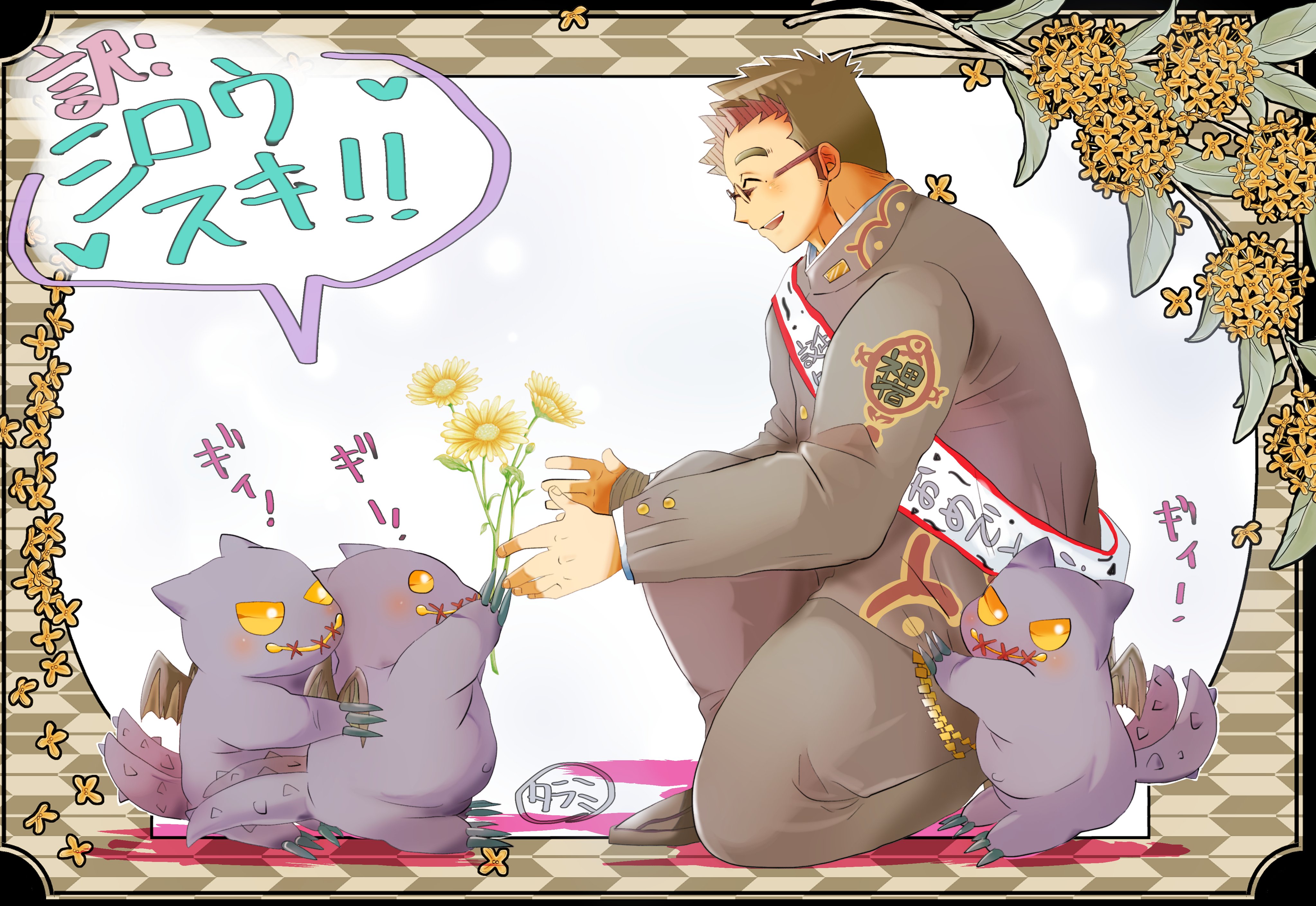 1boy absurdres bara blush border claws devil_(housamo) flower from_side gakuran glasses highres holding holding_flower long_sideburns long_sleeves male_focus motoori_shiro on_one_knee open_mouth pon_tarami sash school_uniform short_hair sideburns smile solo speech_bubble thick_eyebrows tokyo_houkago_summoners translation_request yellow_eyes yellow_flower