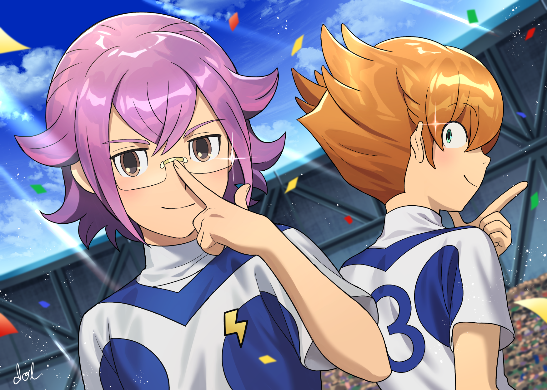 2boys adjusting_eyewear audience blue_sky brown_eyes cloud confetti crowd dolustoy glasses green_eyes highres inazuma_eleven_(series) inazuma_eleven_go inazuma_japan looking_at_viewer male_focus manabe_jin'ichirou minaho_kazuto multiple_boys orange_hair purple_hair sky soccer_uniform sportswear stadium