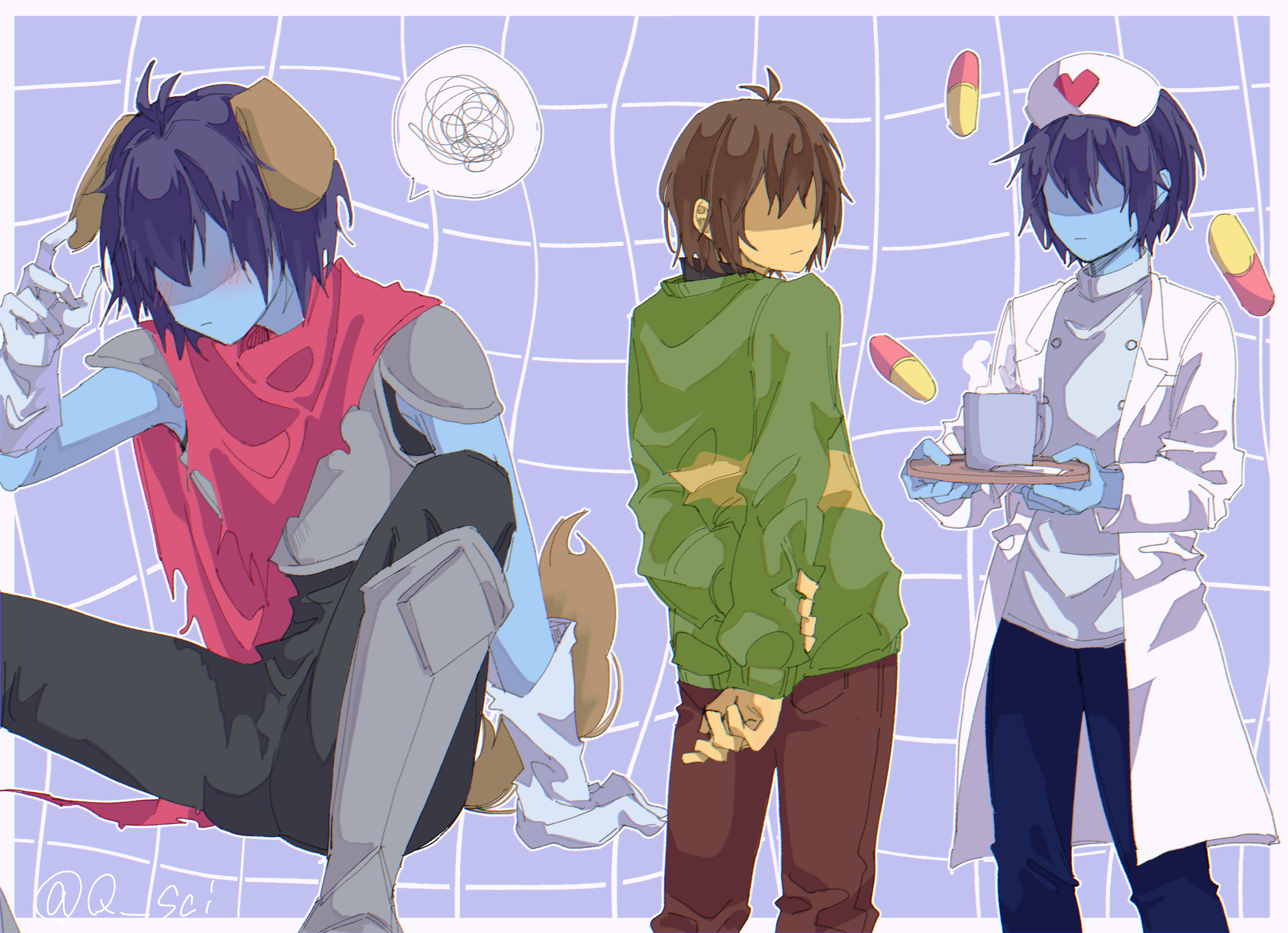 1other absurdres alternate_costume armor black_bodysuit black_hair blue_skin bodysuit cape coat colored_skin covered_eyes deltarune gloves green_sweater heart highres kris_(dark_world)_(deltarune) kris_(deltarune) kris_(takecare)_(deltarune) messy_hair multiple_persona pill red_cape short_hair sitting striped_clothes striped_sweater sweat sweater utdr_(toby_fox) white_coat white_gloves yoshino_(q_sci)