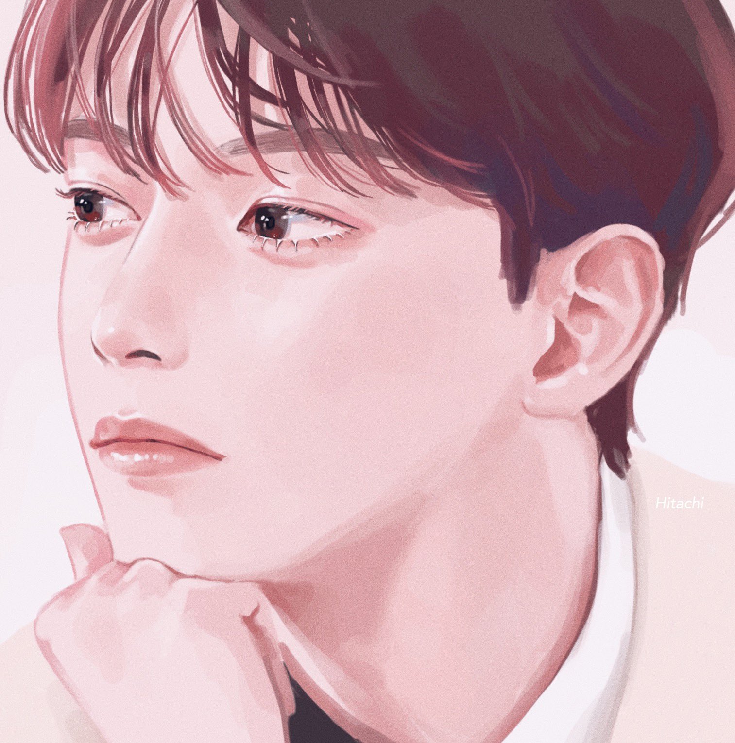 1boy artist_name brown_eyes brown_hair close-up closed_mouth commentary_request eunwoo eyelashes hand_rest highres k-pop looking_to_the_side male_focus pink_lips pinky_purple real_life short_hair simple_background solo