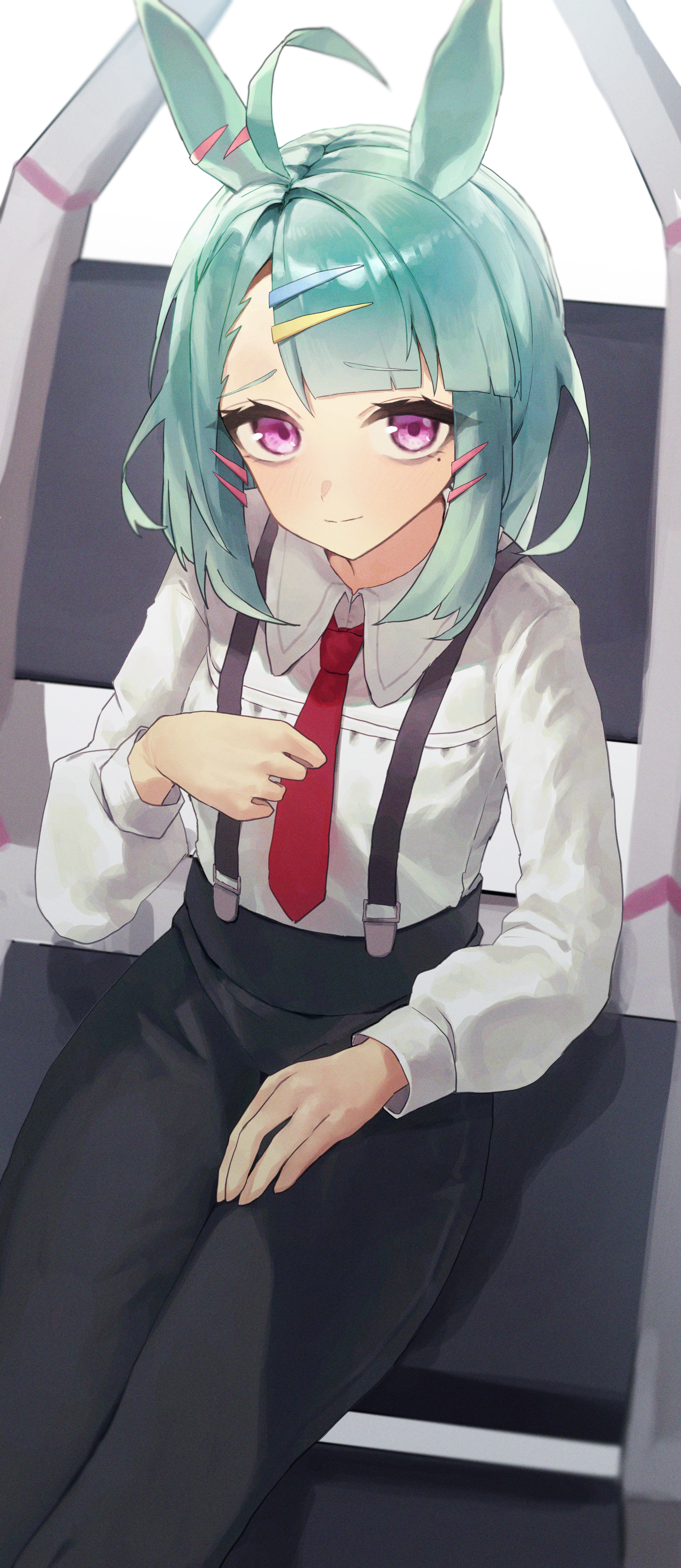 1girl absurdres ahoge animal_ears aqua_hair black_pants collared_shirt commentary_request cowboy_shot earclip hair_ornament hairclip highres horse_ears horse_girl leste_(humansequencer) long_sleeves looking_at_viewer mole mole_under_eye necktie pants purple_eyes red_necktie shirt short_hair sitting solo sugar_lights_(umamusume) suspenders umamusume wheelchair white_shirt