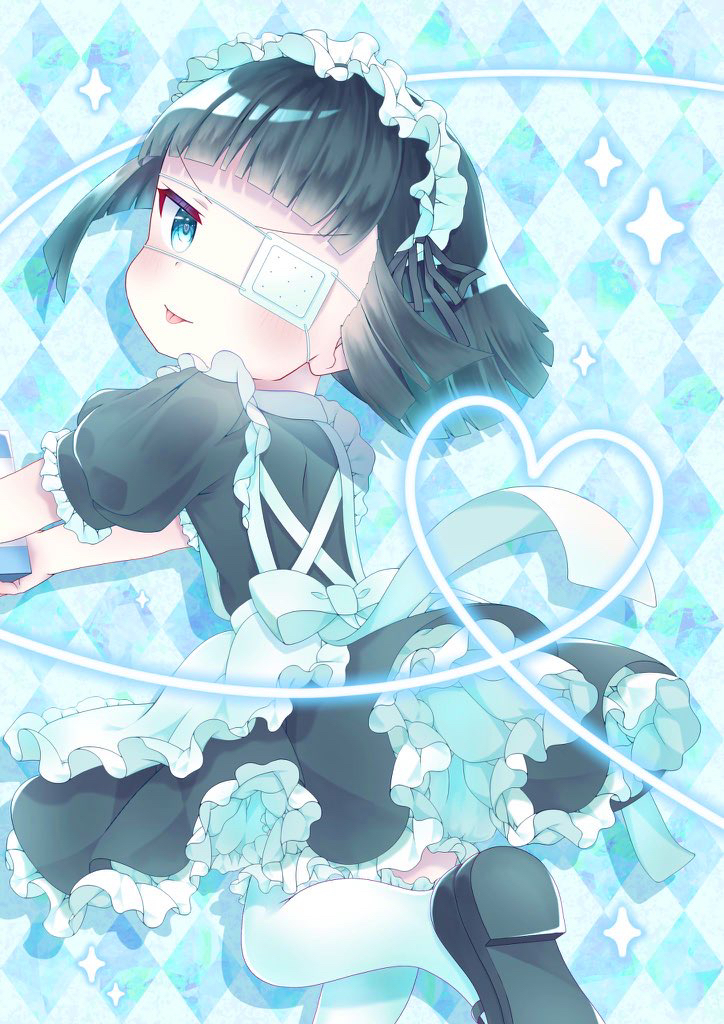 1girl apron black_dress black_hair blue_background bob_cut dress eyepatch heart maid maid_apron maid_headdress original sakakibara_yone short_sleeves solo sparkle standing standing_on_one_leg thighhighs tongue tongue_out white_thighhighs yume_kawaii